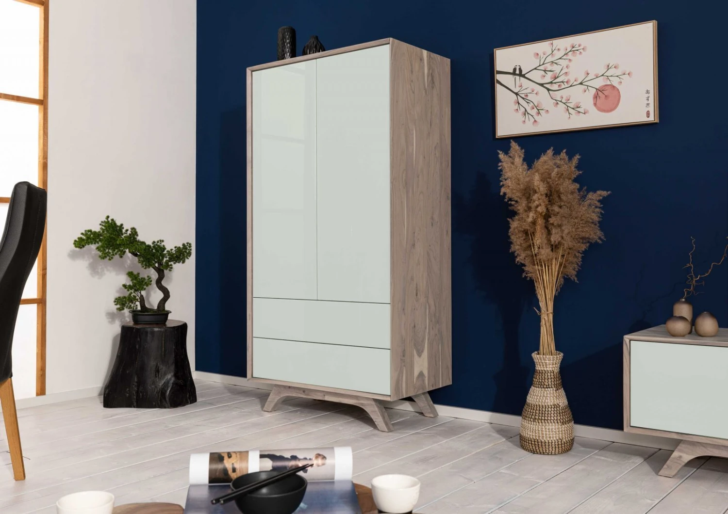 Armoire vintage moderne en acacia massif, verre et MDF