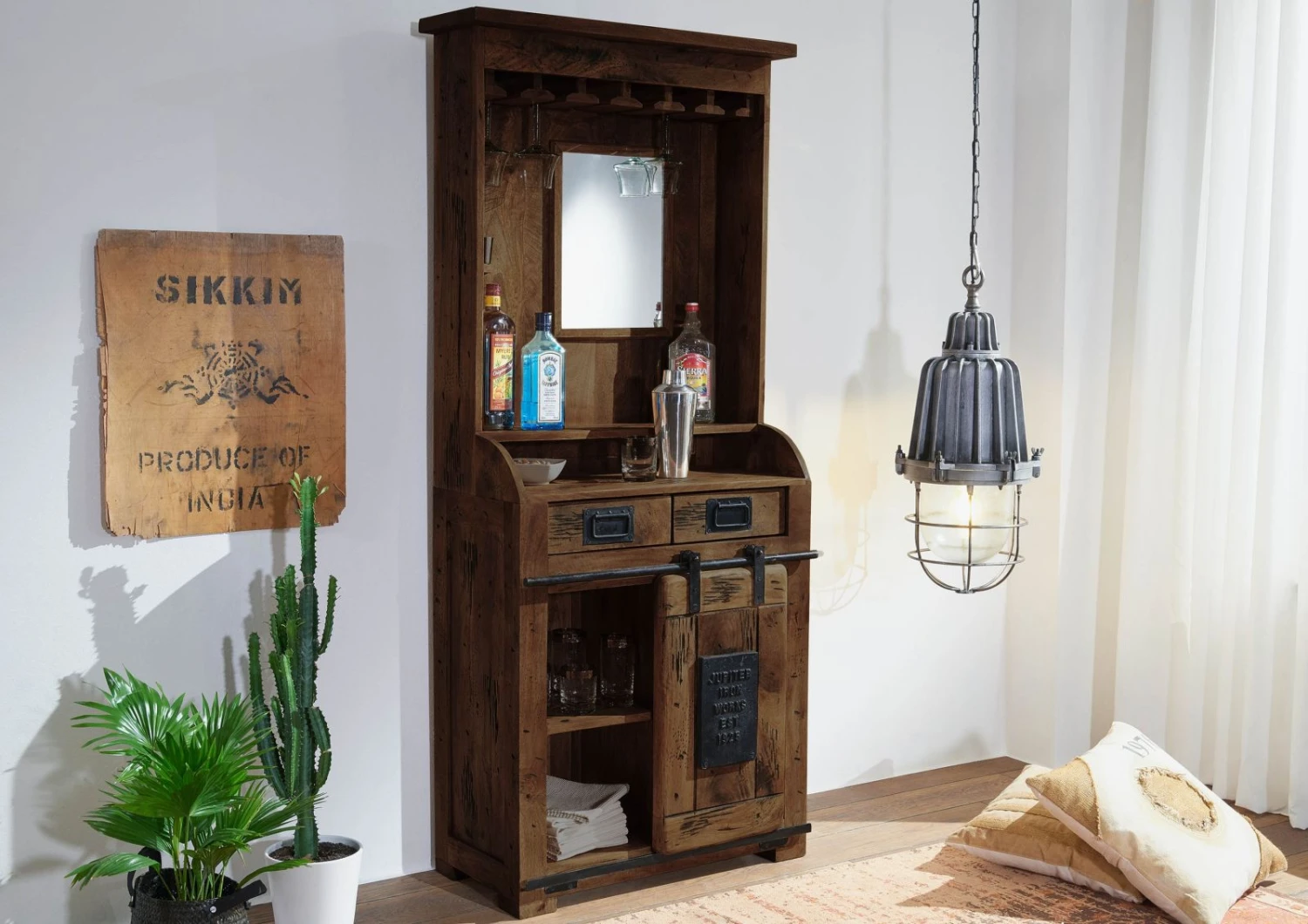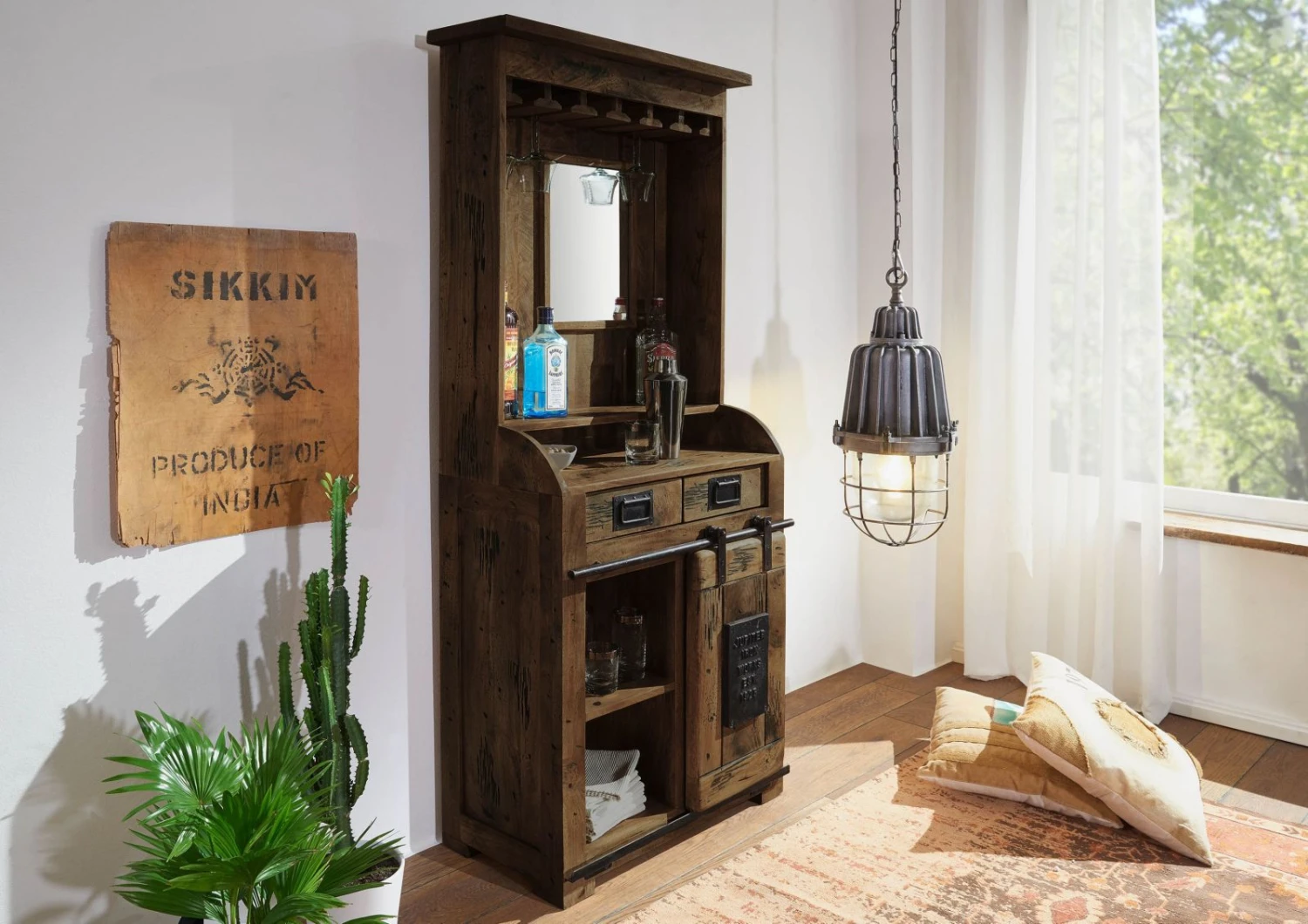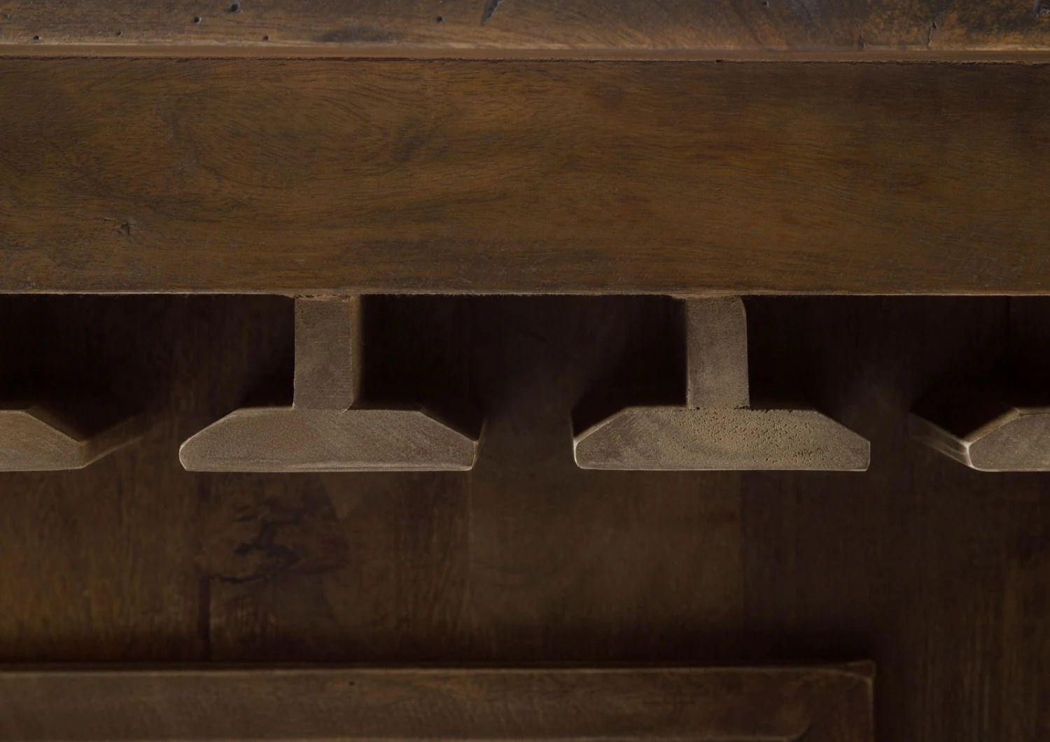 Ce bar en bois massif de la gamme RAILWAY est le meuble idéal pour les amateurs de vin et de cocktails. En effet, il n’est pas seulement esthétique, mais offre également un généreux espace de rangement pour tout ce qui est nécessaire à la préparation et à la dégustation des boissons. Le bar dispose de quatre compartiments intérieurs, de deux tiroirs, d’une étagère intermédiaire ainsi que de plusieurs supports pour les verres à vin. De quoi ranger facilement serviettes, verres et shakers.