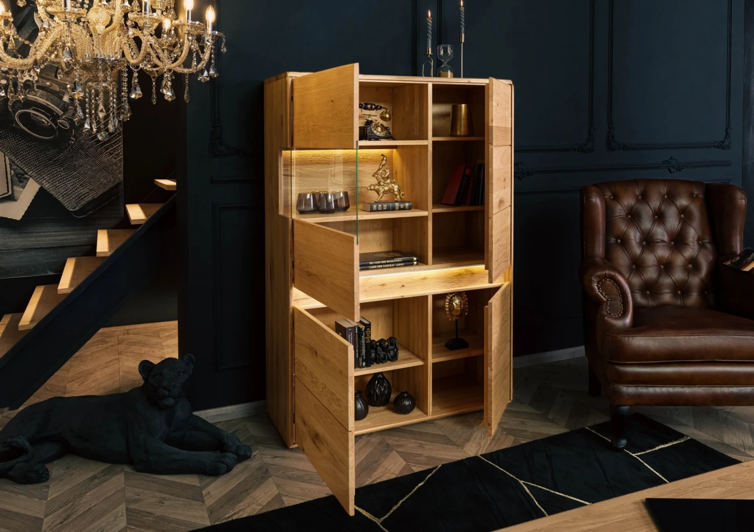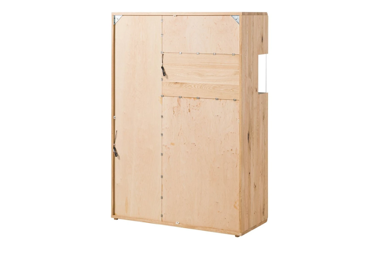 Un placard avec deux portes en bois massif et deux étagères en bois réglables