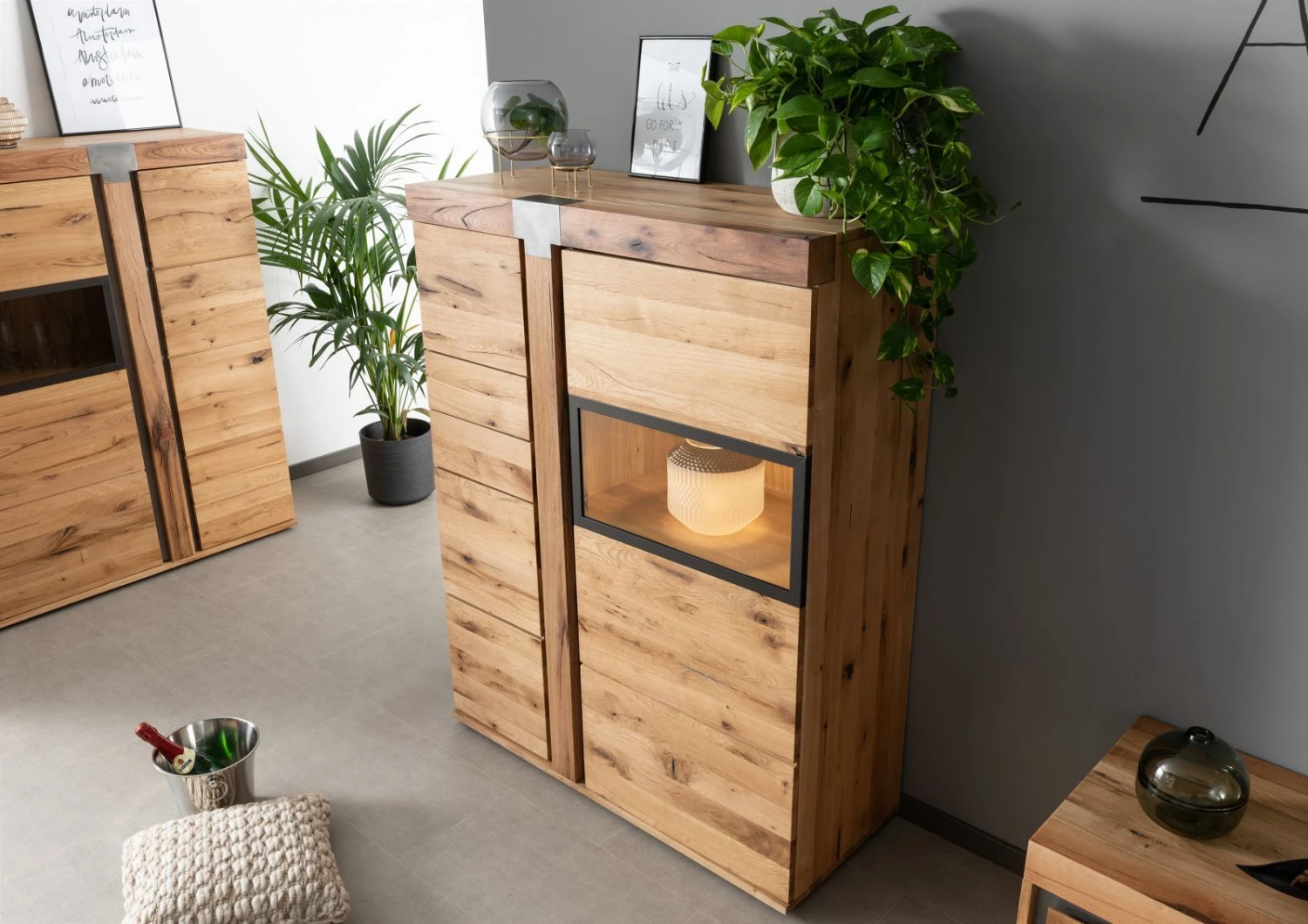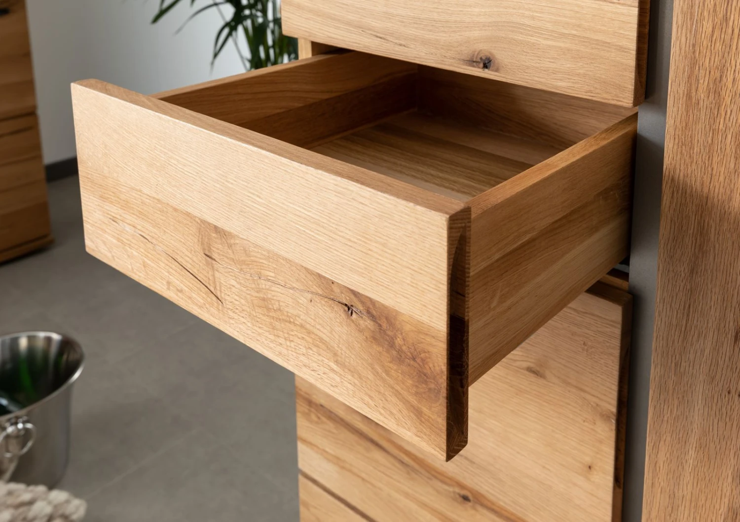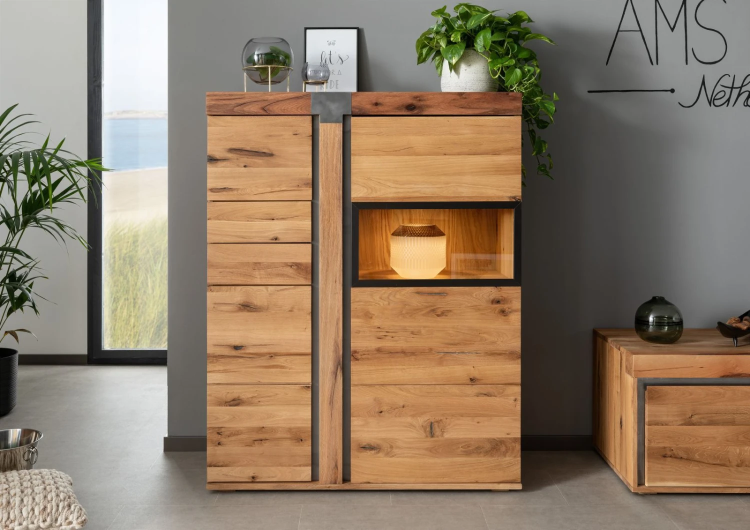 Les meubles de notre série NEW AMSTERDAM ne sont pas uniquement sobres et classiques. Ces pièces individuelles et époustouflantes se caractérisent aussi par leurs lignes à la fois modernes et minimalistes. Parfaite association entre le bois et le métal, le designer Erik Quicker, à lorigine de cette série, a notamment souhaité conserver laspect naturellement irrégulier du chêne lombard. Lapplication dune très fine couche d’huile permet de protéger cette surface, non lisse au touché, tout en soulignant et embellissant les imperfections naturelles de ce bois massif (nuds, trous, fissures). Les inserts métalliques, ainsi que labsence de poignée aux tiroirs et aux portes, permettent dapporter une belle touche doriginalité et de modernité à ces meubles qui trouveront donc une place idéale dans un intérieur à la fois contemporain, élégant et naturel.