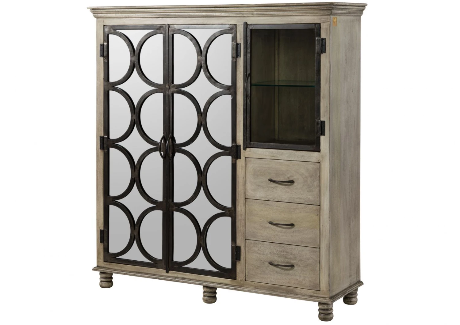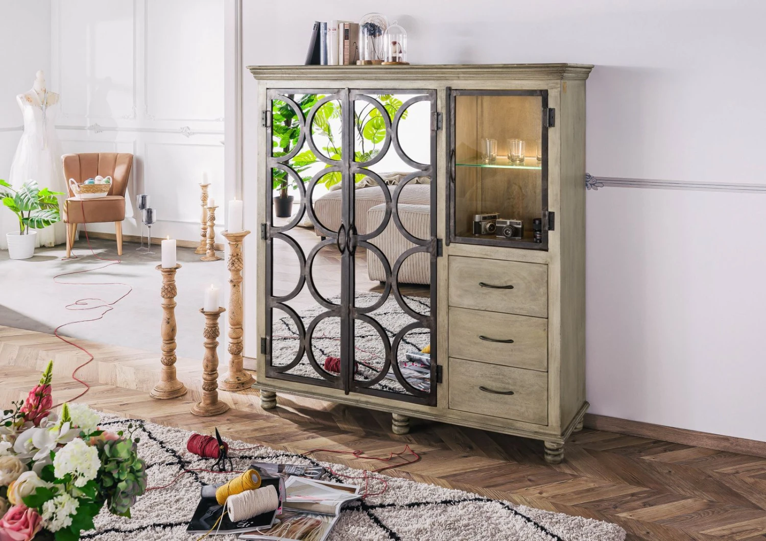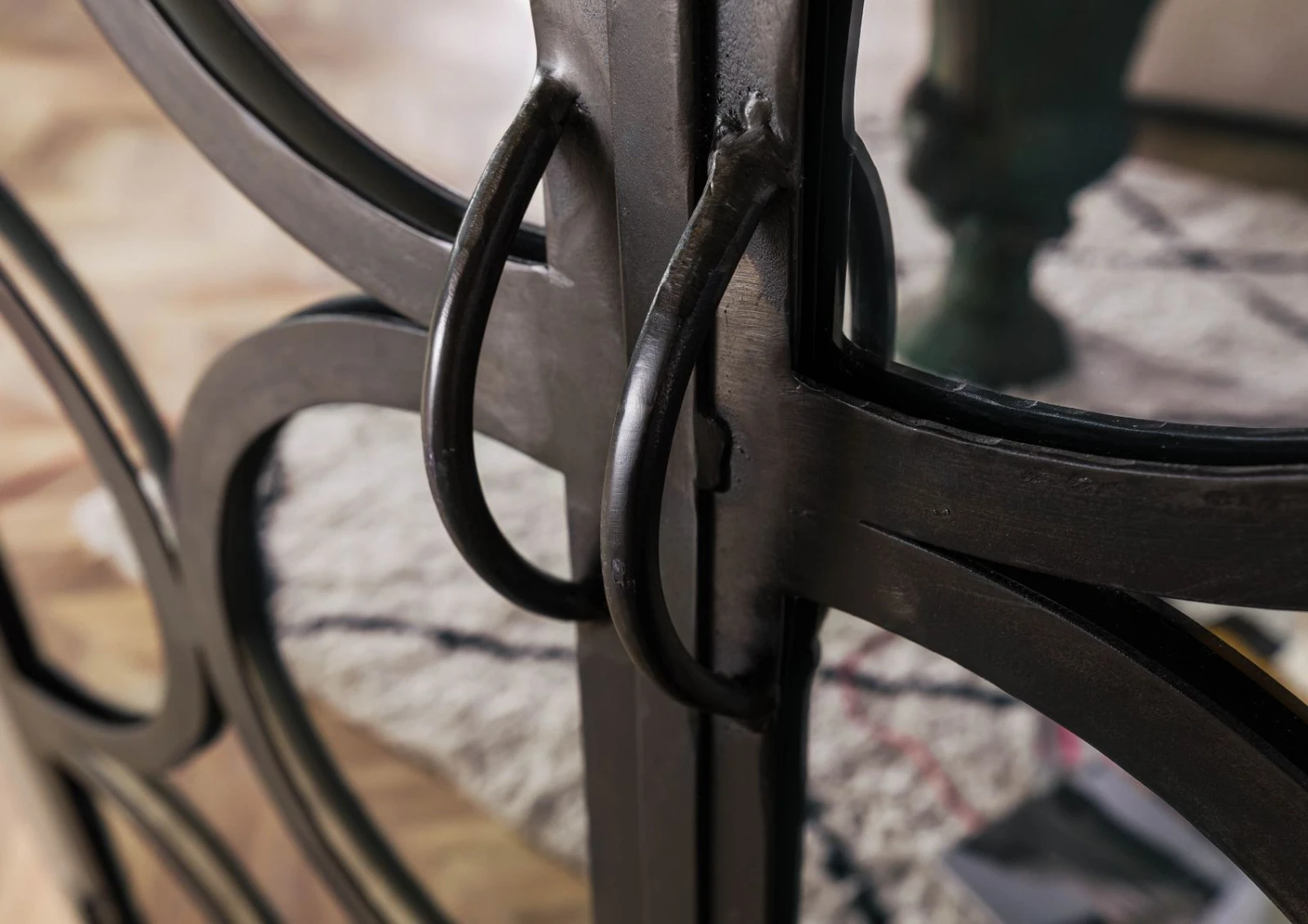 Un placard de rangement avec double porte en fer forgé et vitrée