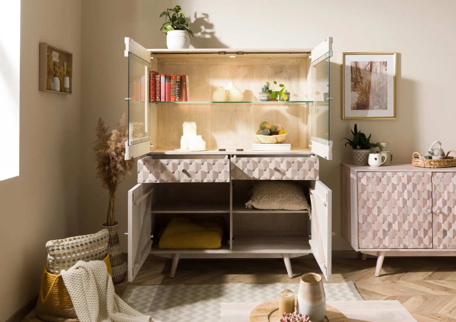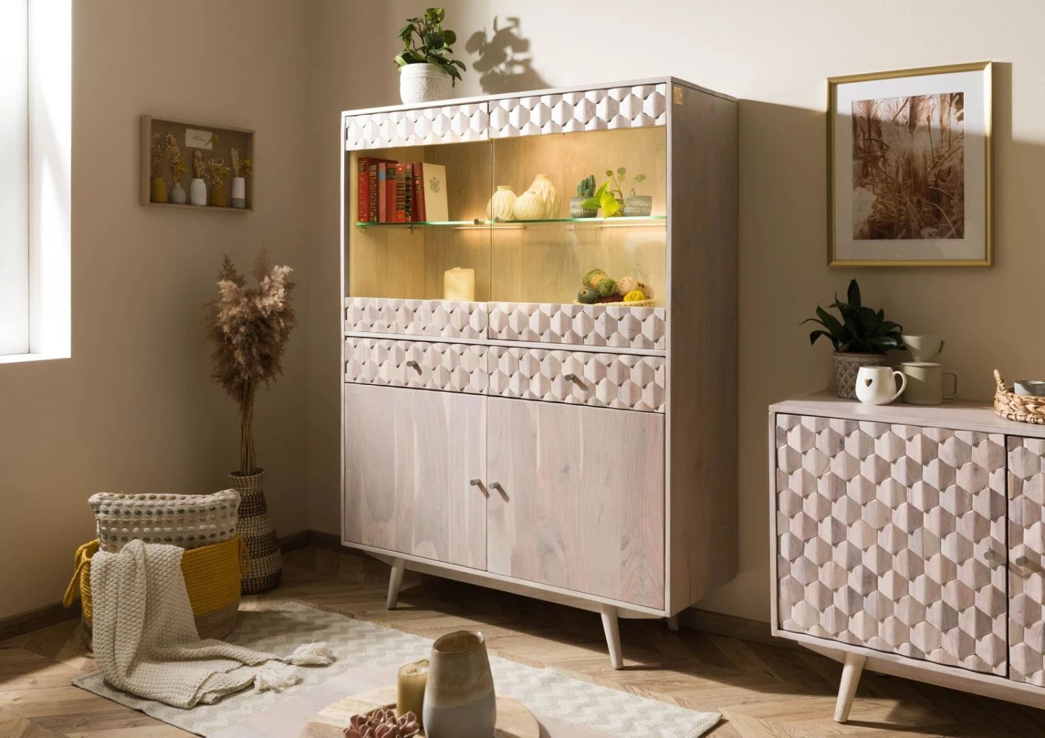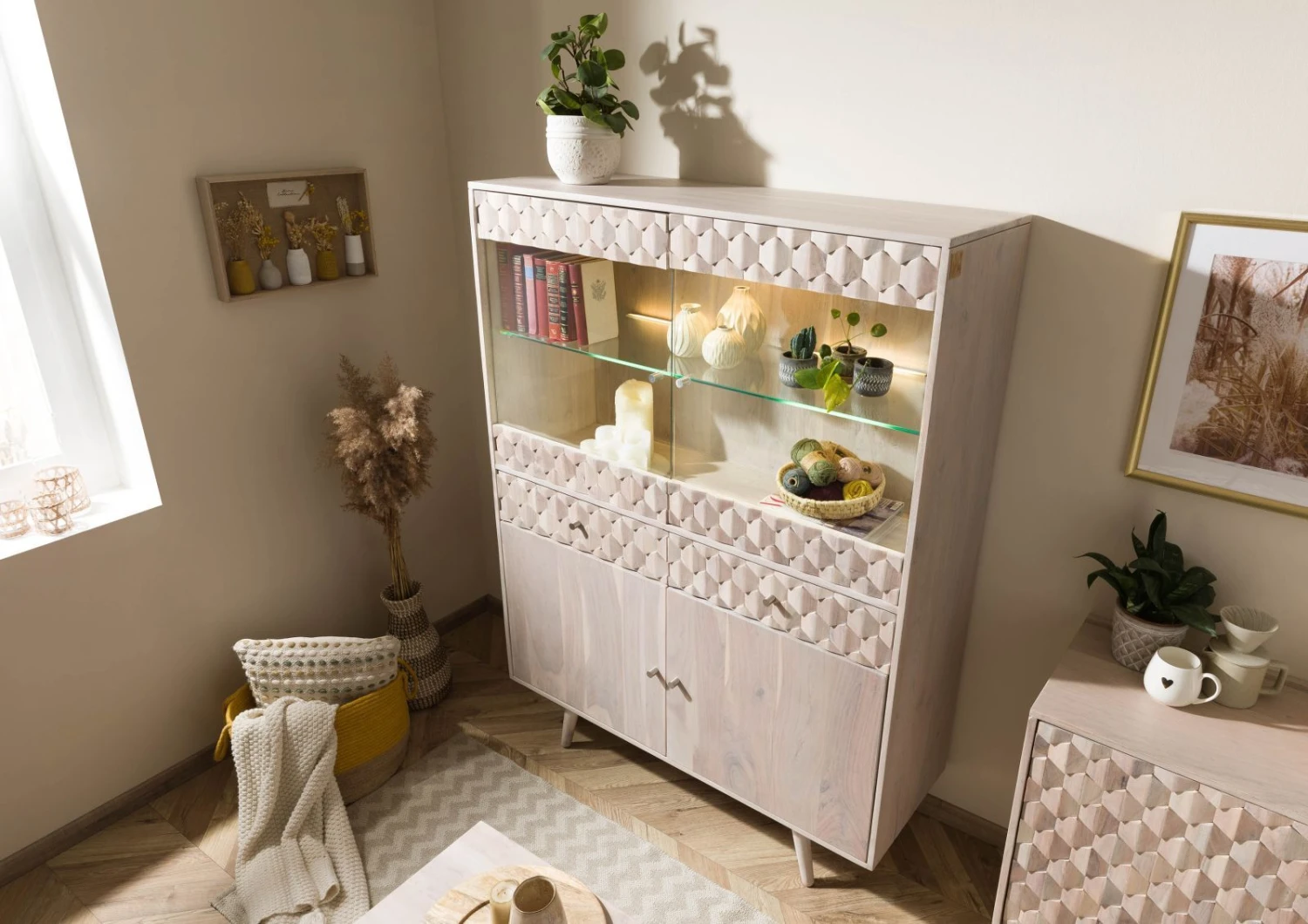 Objets design et autres pièces dignes d’être exposées trouveront toute la place nécessaire derrière les portes vitrées : d’élégantes étagères en verre permettent ici de voir les deux niveaux de la vitrine. Les tiroirs offrent quant à eux un espace de rangement pour les petits objets personnels, tandis que les objets plus volumineux et les accessoires pour la maison peuvent être rangés derrière la double porte inférieure. Pour résumé, ce buffet haut de 120 cm de large est un meuble à la fois pratique et plein d’élégance qui, grâce au résistant bois d’acacia, embellira pendant longtemps n’importe quel salon si vous l’entretenez de manière appropriée.
