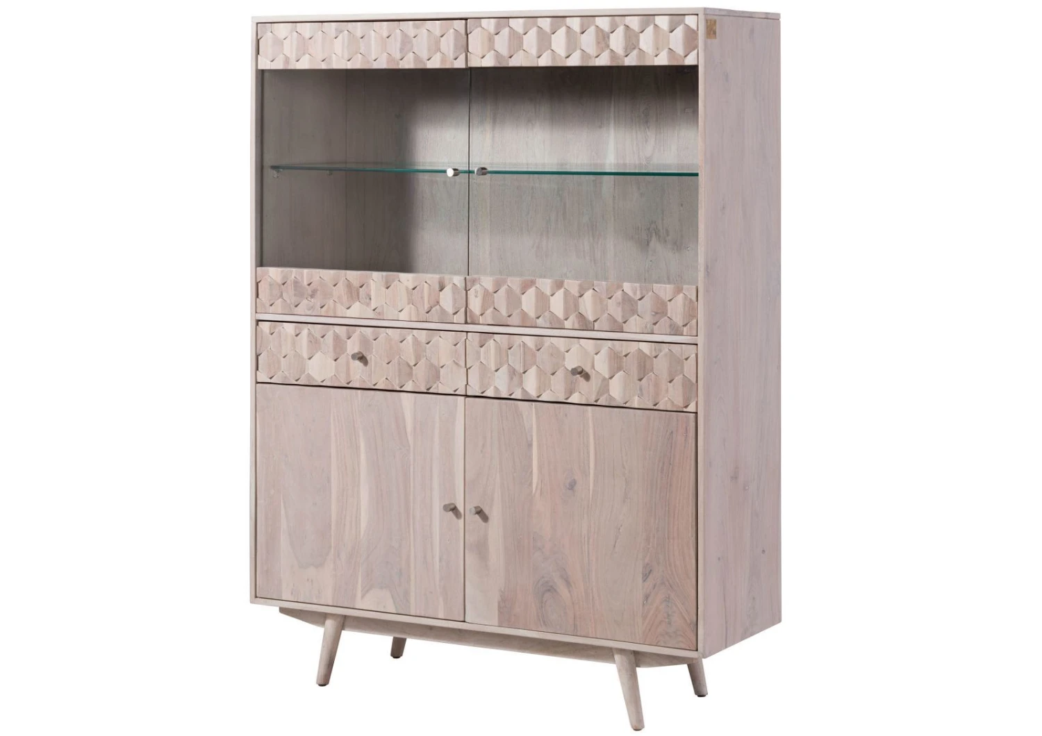 Les lignes droites de son design et ses pieds tournés vers l’extérieur, dans le plus pur style des sixties, font de ce buffet haut de la gamme MOSAYK une pièce pleine de charme, et ce, dans n’importe quel salon. Fabriqué en acacia massif, sa structure en nid d’abeilles, qui habille non seulement les deux tiroirs, mais aussi les portes en verre dans la partie supérieure, attire particulièrement l’attention sur la surface recouverte d’un vernis clair.