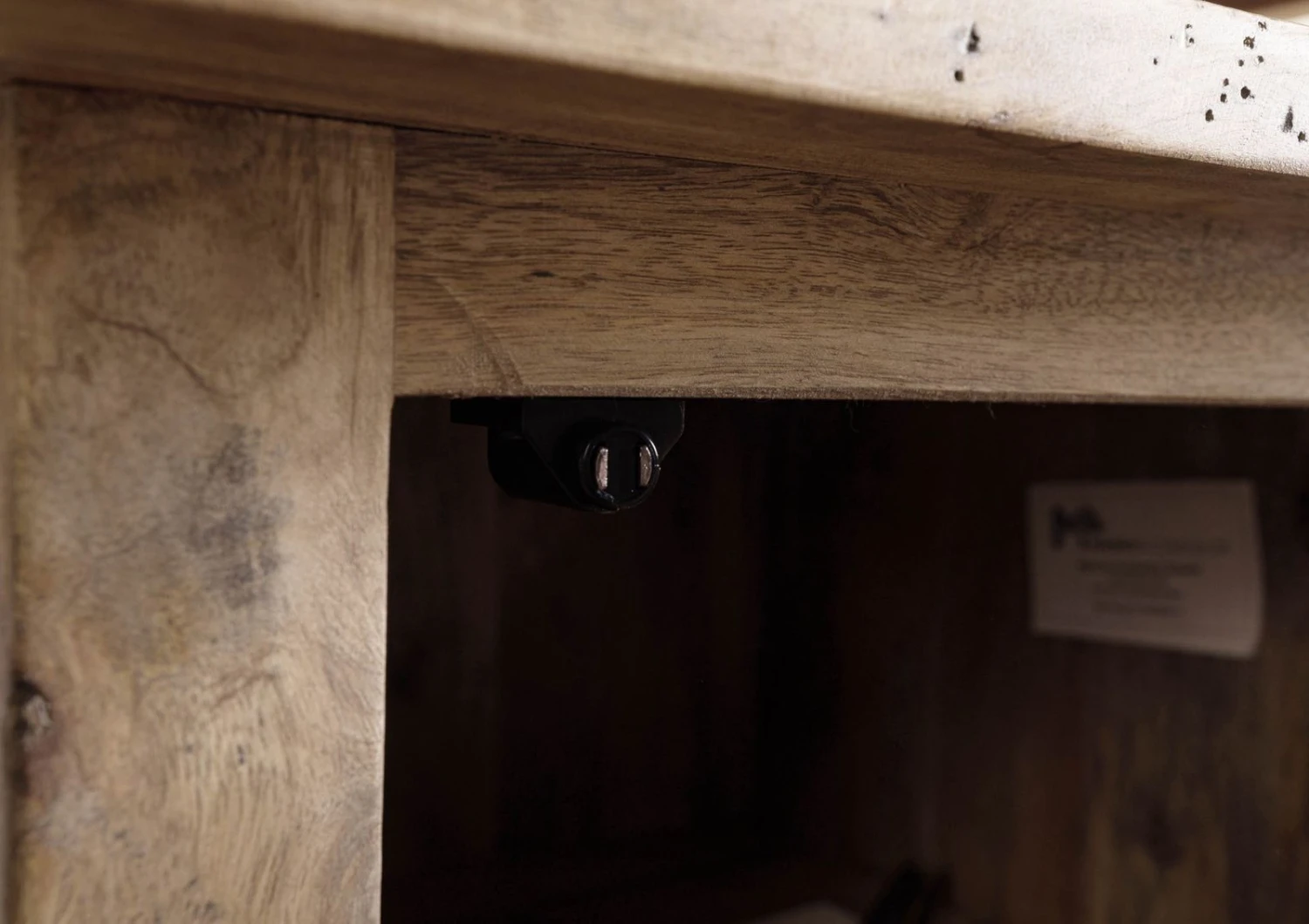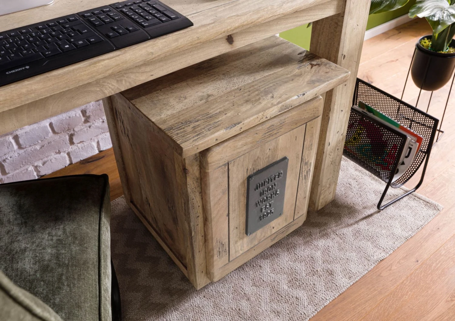Ses éléments design de très grande qualité en font un véritable accroche-regard. Parmi eux figurent notamment l’élégante plaque de métal qui orne la porte ainsi que les finitions des surfaces : les fissures et irrégularités typiques du bois de manguier ont été accentuées et viennent sublimer ce caisson roulant grâce à l’aspect Used-Look ultra-tendance qu’elles lui confèrent. Ce petit meuble de bureau s’intègre ainsi parfaitement dans un intérieur de style rustique.