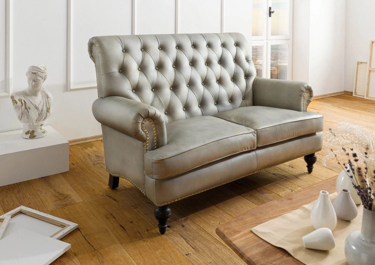 - élégant canapé 2 places Chesterfield, en cuir véritable de couleur grise