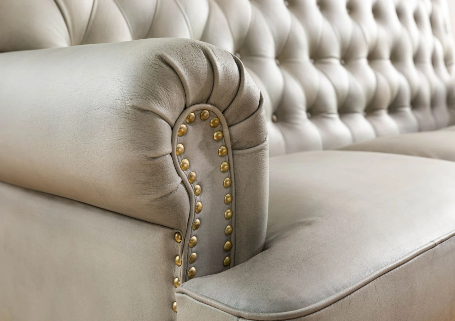 - caractéristiques typiques des canapés Chesterfield : des rivets dorés et des surpiqûres d’un grand raffinement
