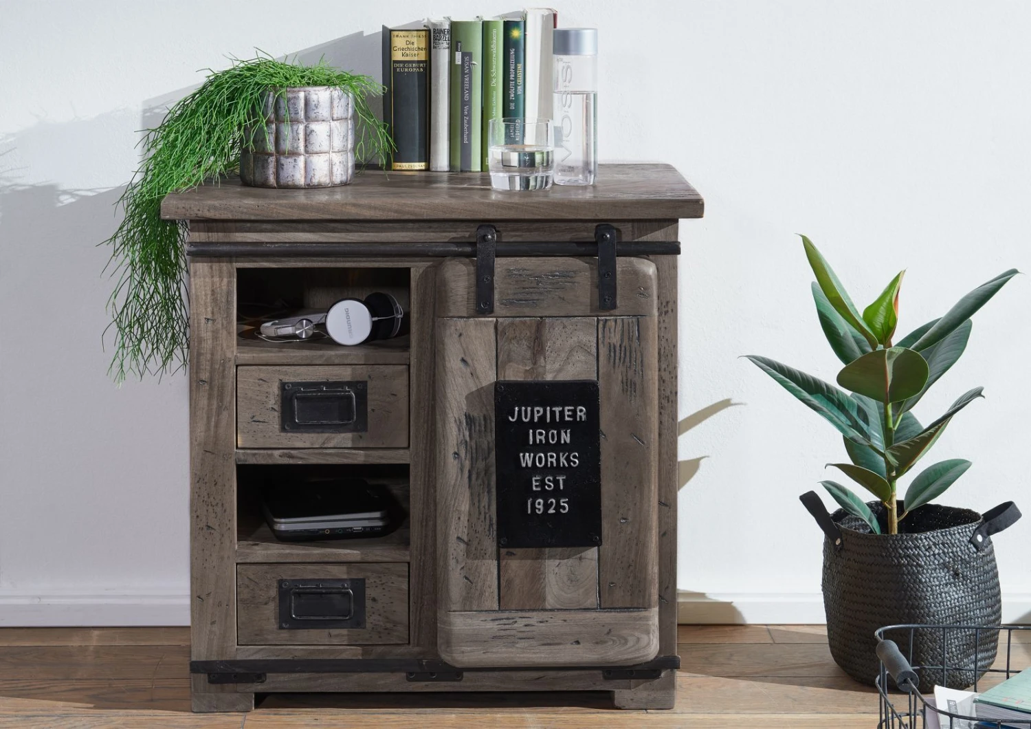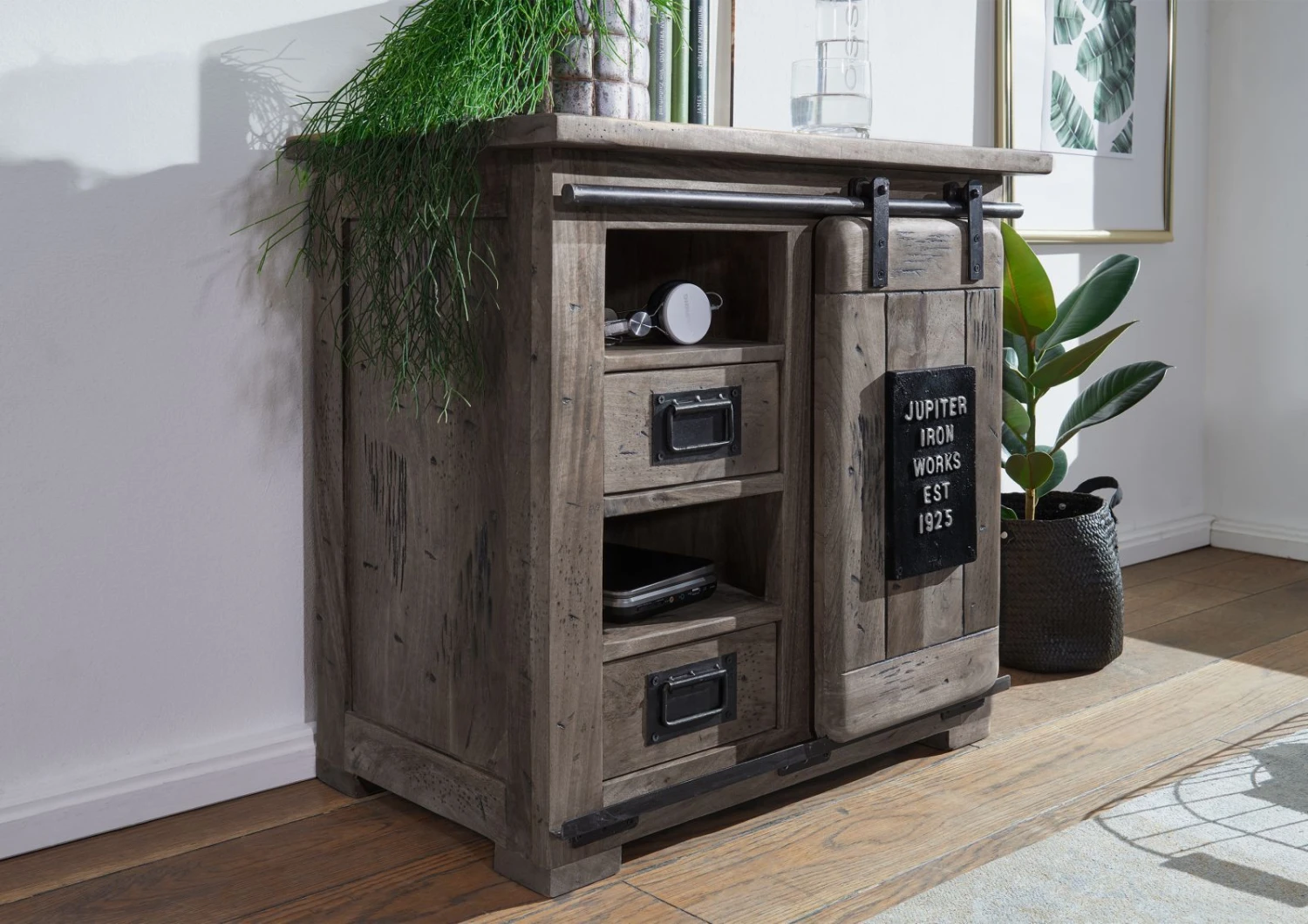 Ce meuble extrêmement pratique est entièrement réalisé en bois de manguier massif. Un bois considéré comme ayant un caractère particulièrement marqué. Visuellement, celui-ci se distingue par son veinage à nul autre pareil, qu’un traitement ultérieur a encore davantage magnifié. Il en résulte un style Used-Look, auquel des détails en fer sombre sur la porte coulissante et les tiroirs viennent apporter la touche finale. Cette commode est une pièce de style industriel qui s’intègre parfaitement dans n’importe quel intérieur.