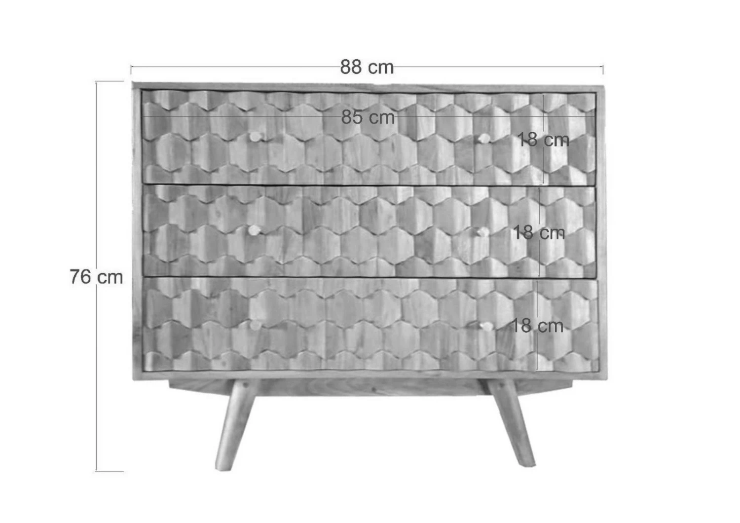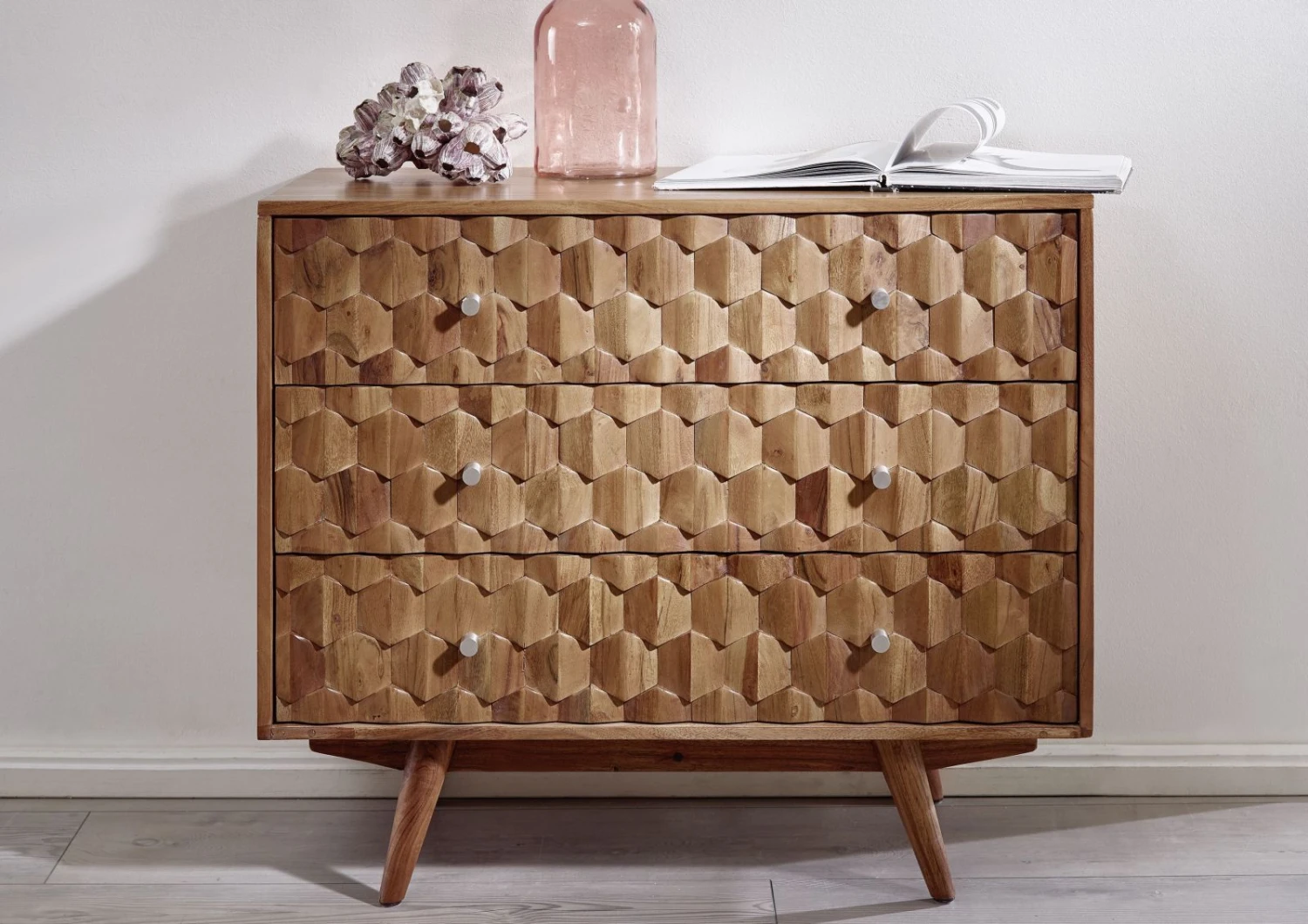 Résolument vintage, la commode Mosayk est en bois d´acacia massif, la façade des tiroirs, travaillée artisanalement en fait un meuble qui sort de l´ordinaire.