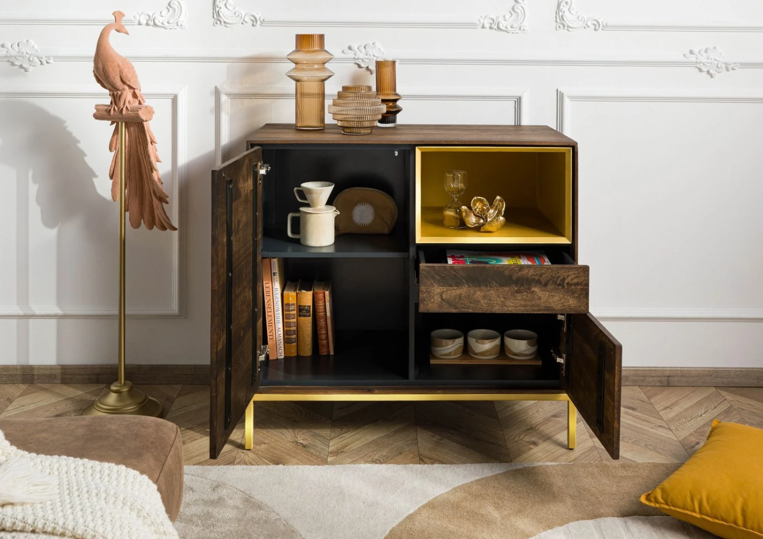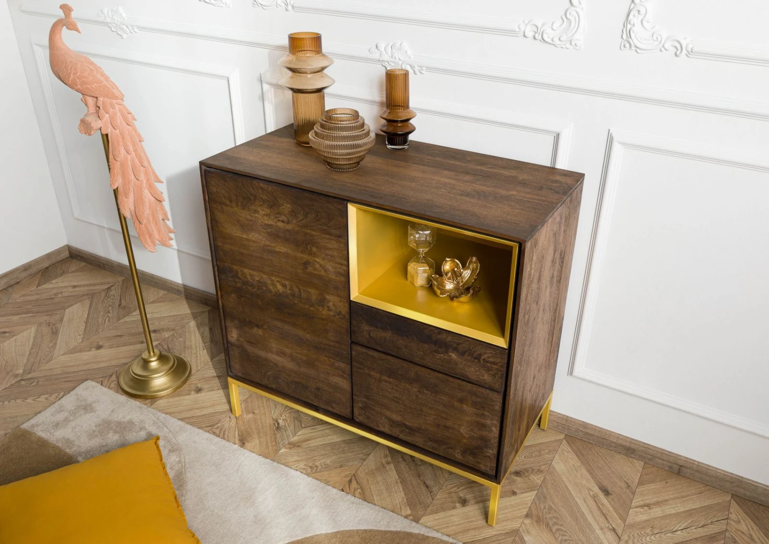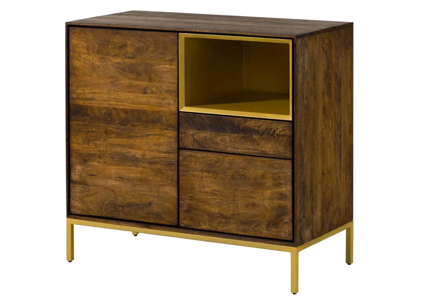 Le compartiment doré et les pieds assortis contrastent avec le bois de manguier huilé gris et lui donne lénergie de la modernité. C´est un meuble qui accrochera les regards, et qui est aussi très pratique : plusieurs compartiments de rangement aux tailles différentes s´ouvrent d´une simple pression.
