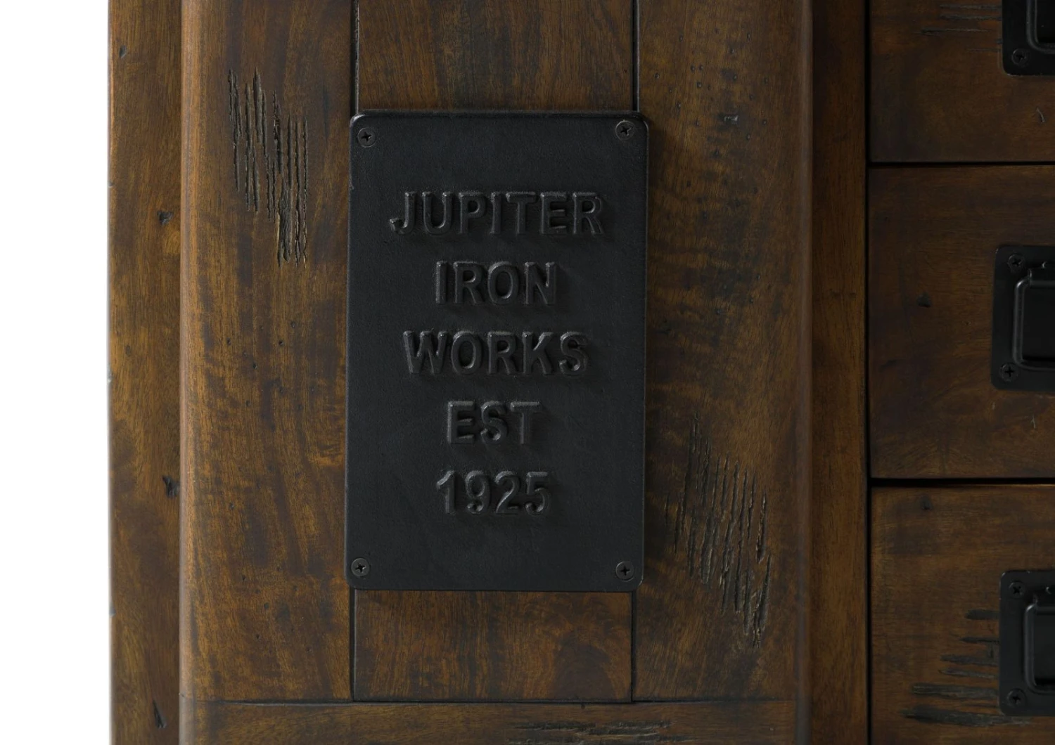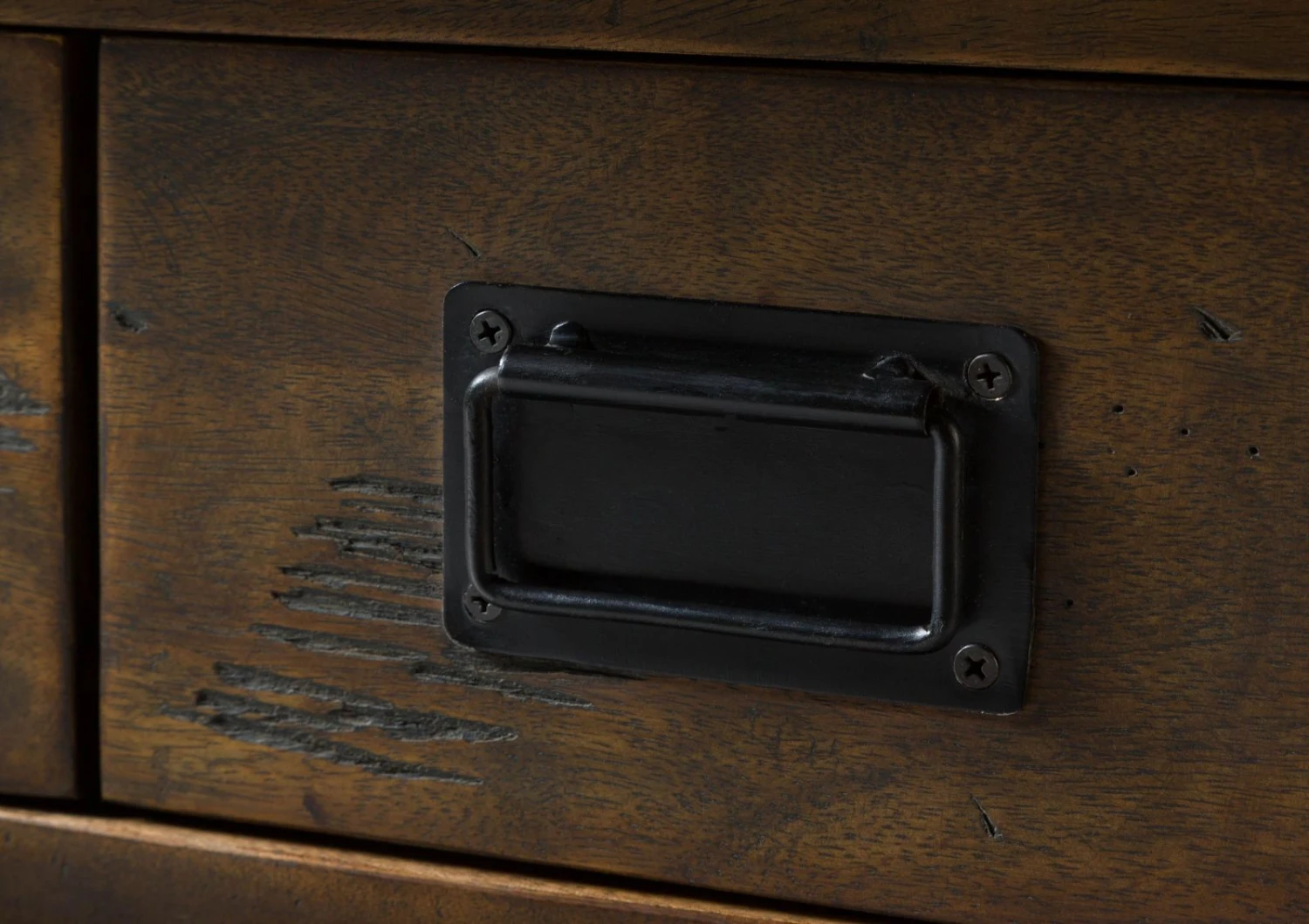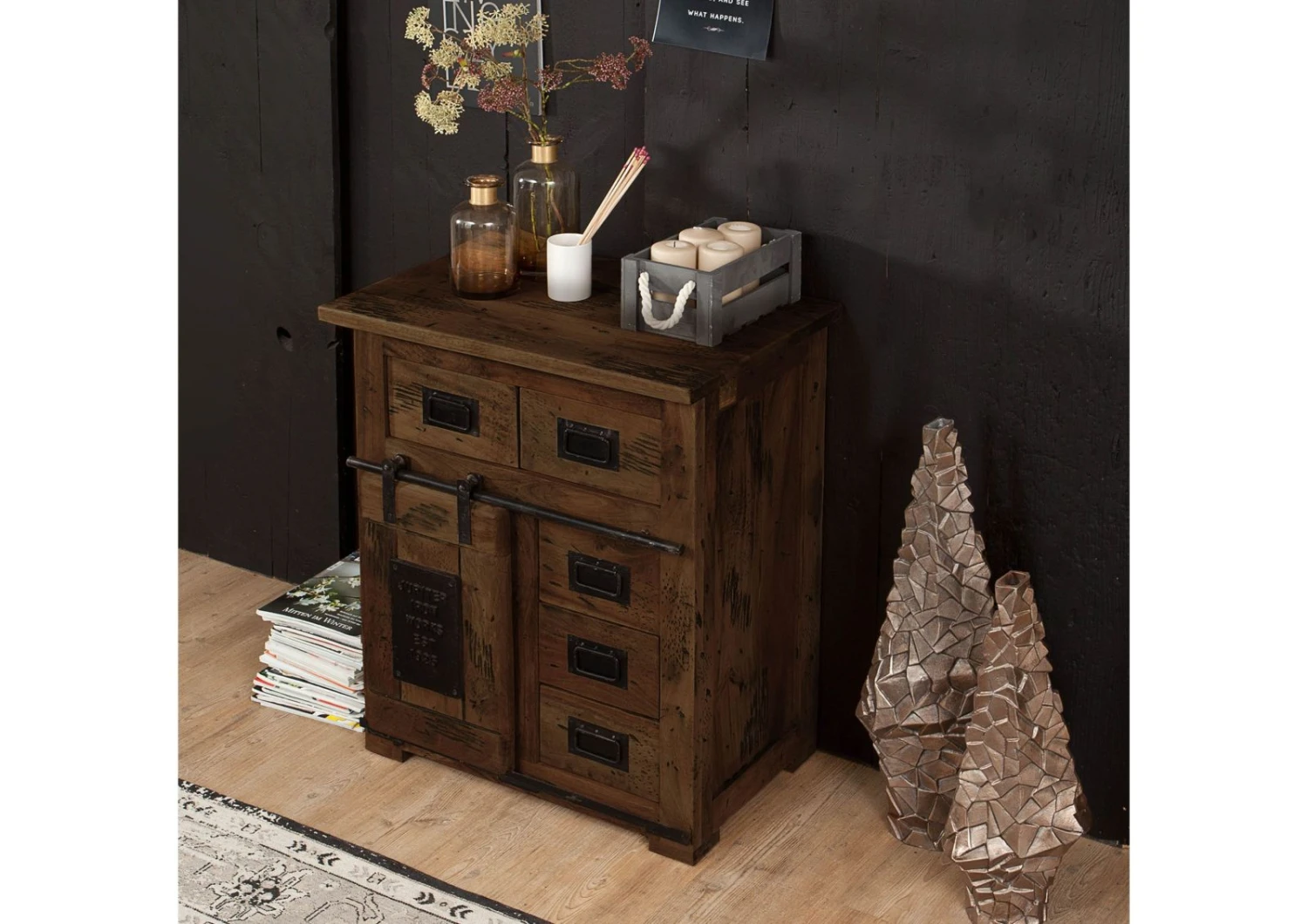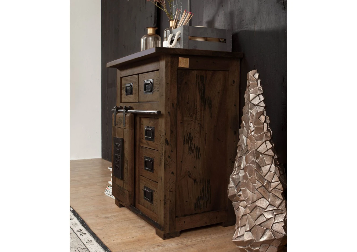 Visuellement, la porte coulissante constitue un autre point fort de ce meuble de style industriel. Cette dernière peut être déplacée sur une barre en fer fixée à l’avant du meuble. Vous pouvez ainsi dissimuler au choix trois des cinq tiroirs ou les deux grands compartiments ouverts. L’élément en fer de la porte, finement travaillé, apporte la touche finale à cette commode et souligne son caractère hors du commun.