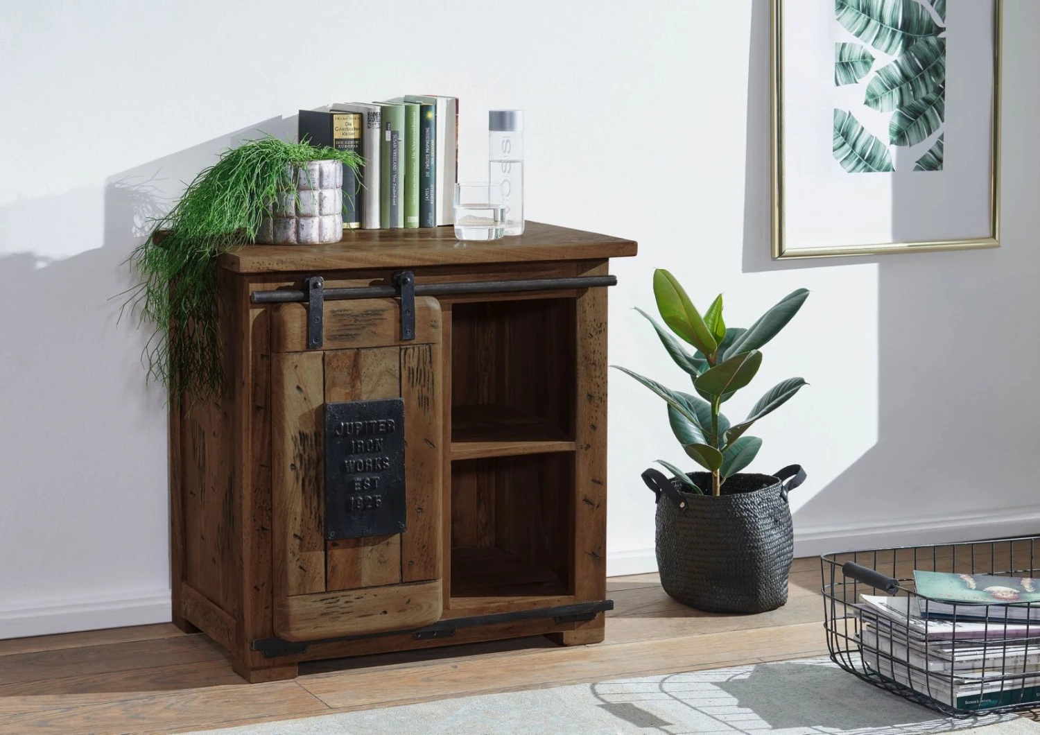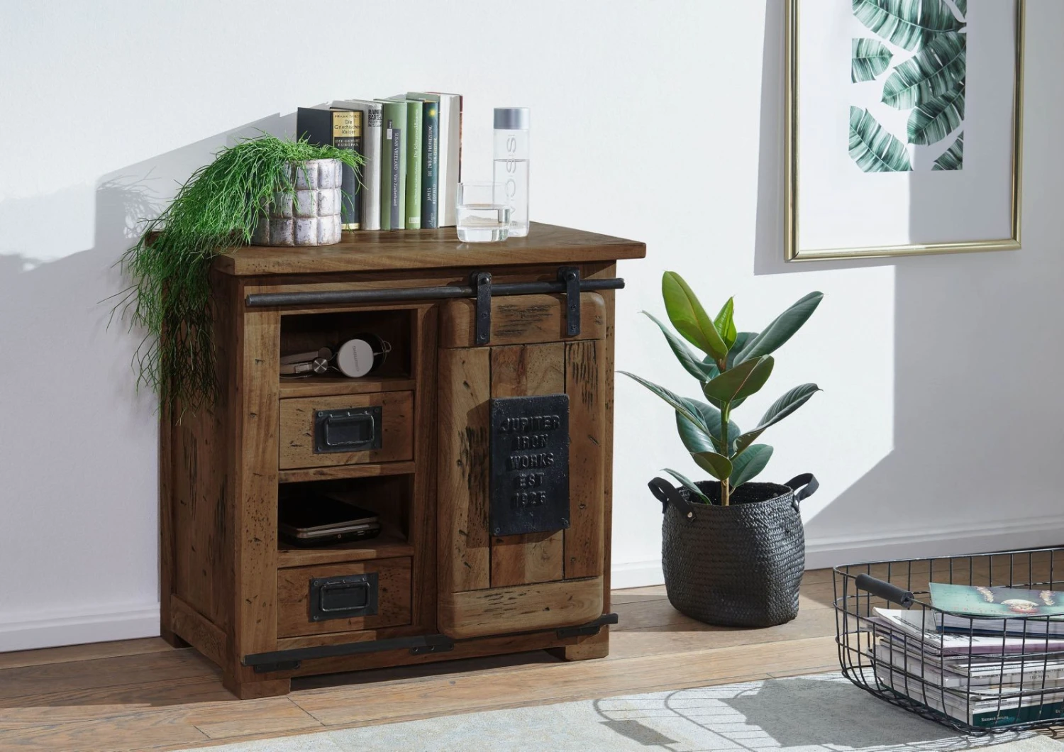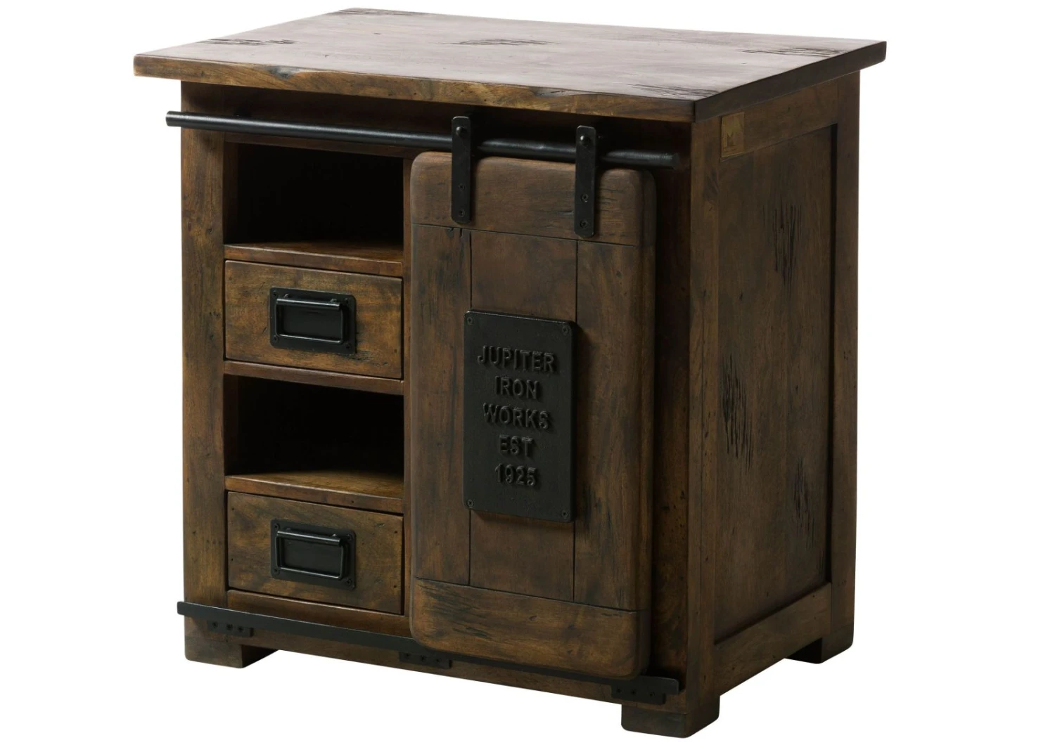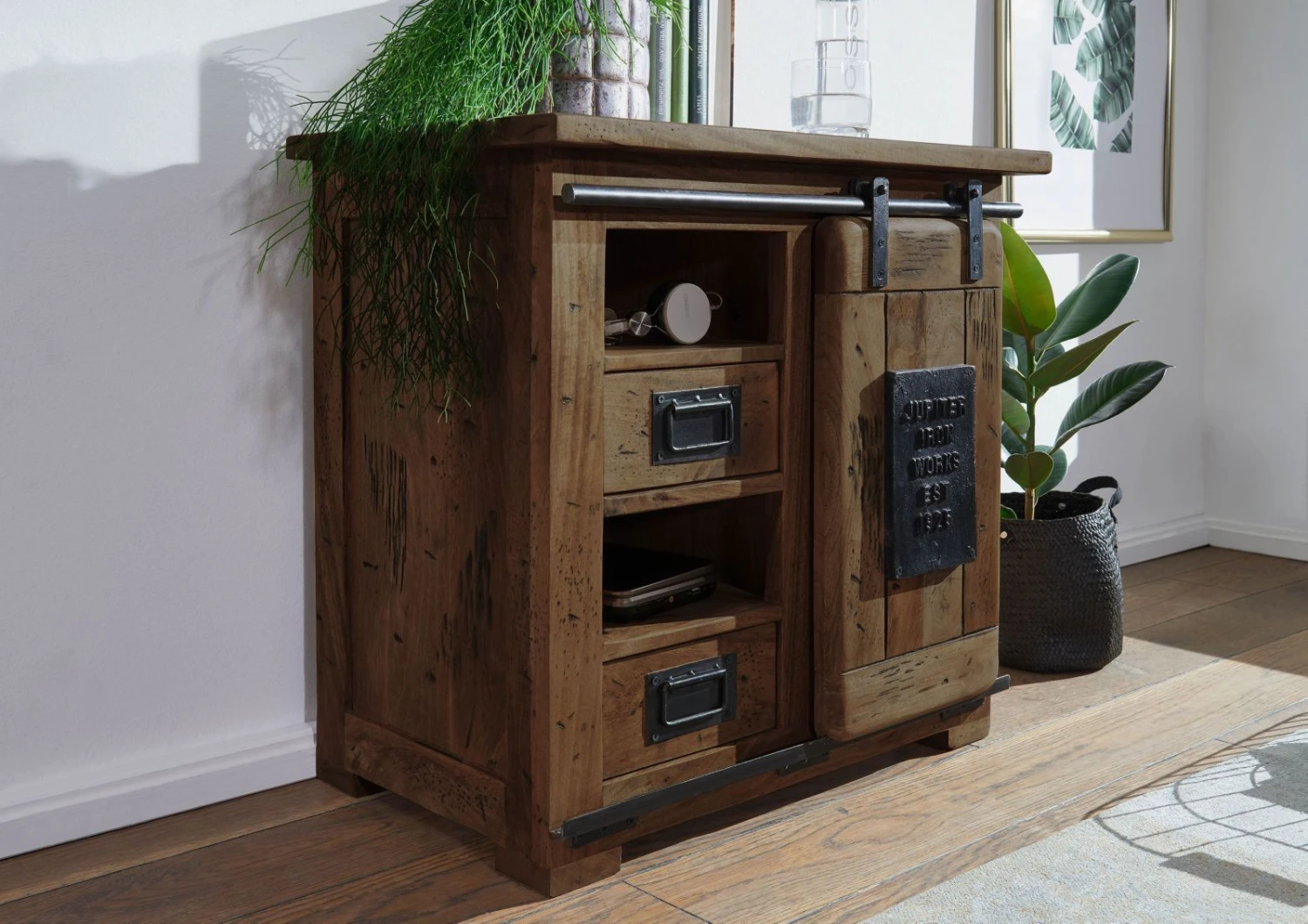 Ce meuble extrêmement pratique est entièrement réalisé en bois de manguier massif. Un bois considéré comme ayant un caractère particulièrement marqué. Visuellement, celui-ci se distingue par son veinage à nul autre pareil, qu’un traitement ultérieur a encore davantage magnifié. Il en résulte un style Used-Look, auquel des détails en fer sombre sur la porte coulissante et les tiroirs viennent apporter la touche finale. Cette commode est une pièce de style industriel qui s’intègre parfaitement dans n’importe quel intérieur.