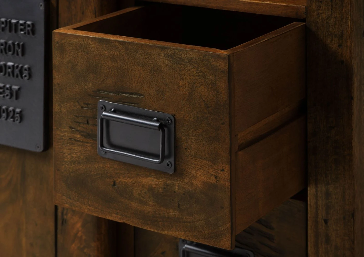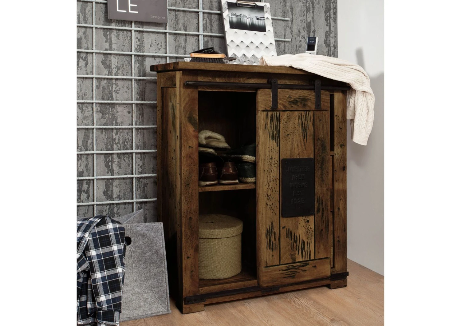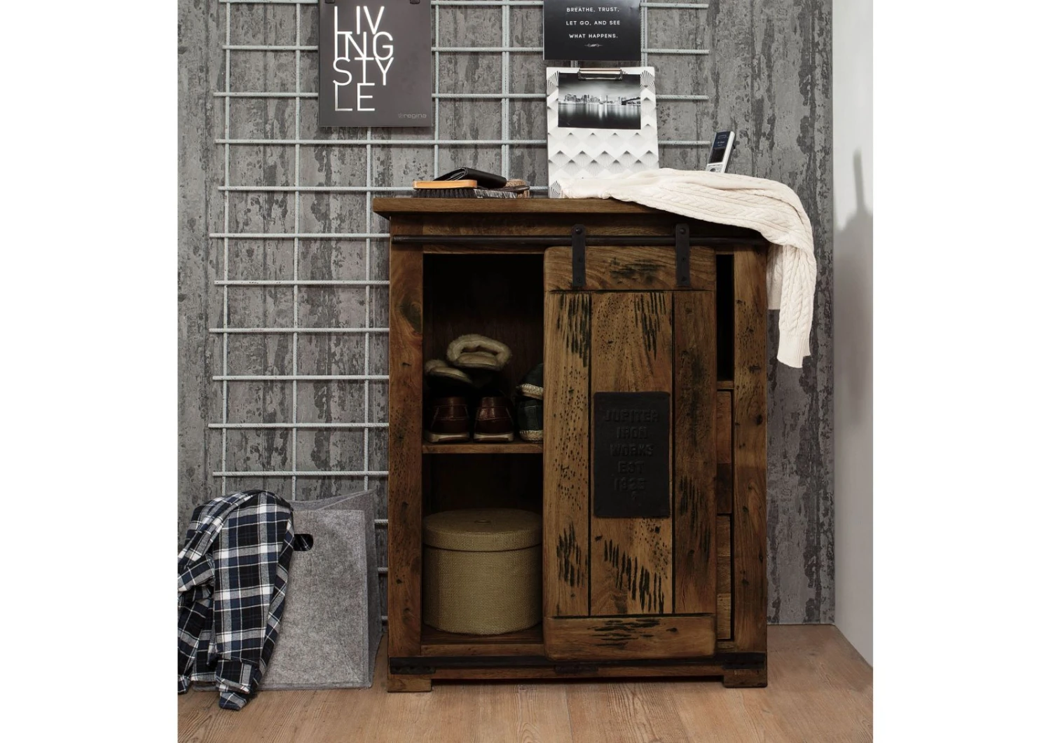 Un espace de rangement au style industriel : petite commode en bois massif