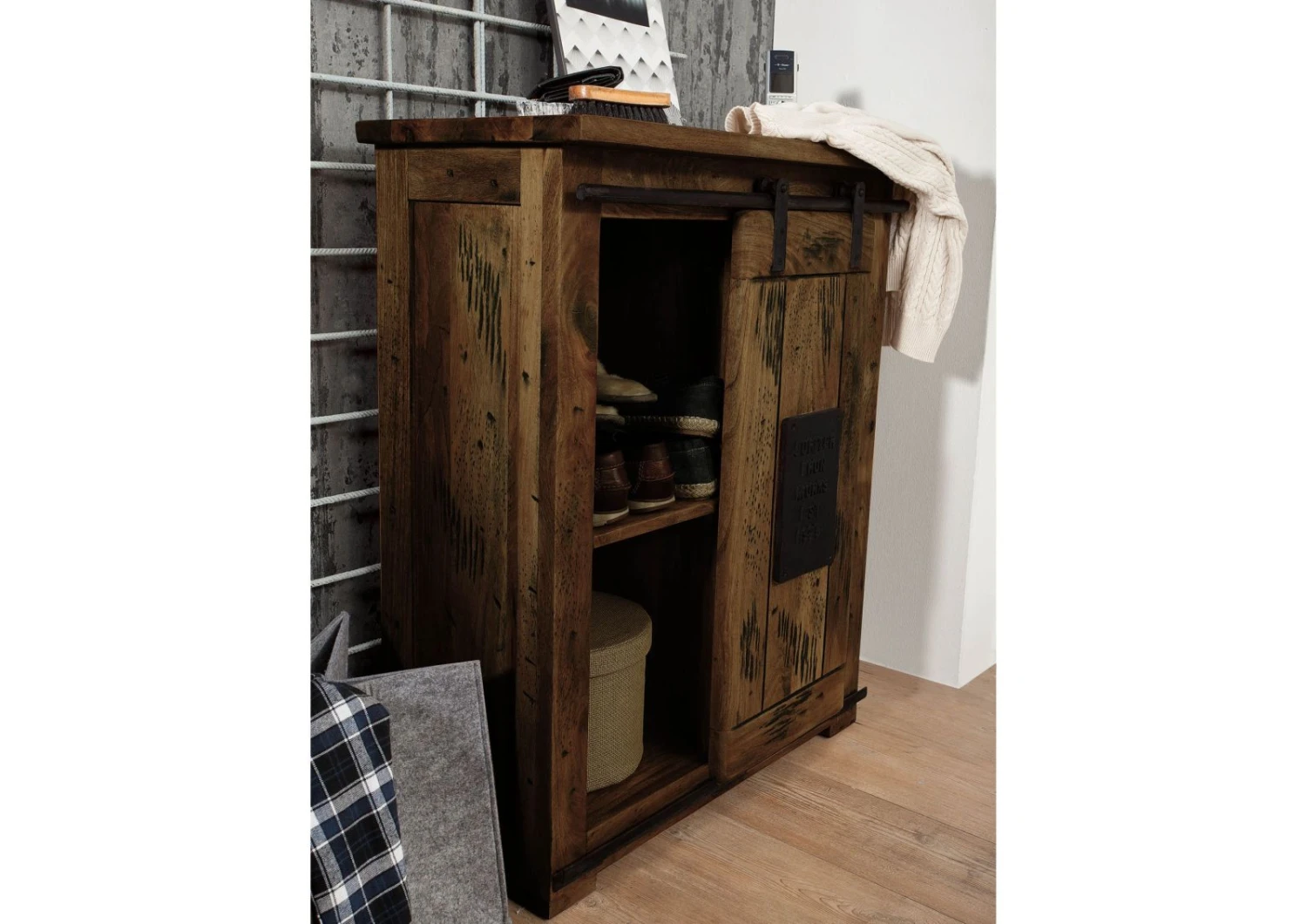 À l’intérieur, vous disposez de suffisamment d’espace pour ranger chaussures, boîtes de rangement ou autres accessoires. La commode se compose en effet detrois compartiments ouverts aux dimensions généreuses et de deux tiroirs spacieux. La moitié de la commode peut être cachée grâce à une porte coulissante frontale, vous permettant ainsi de modifier l’apparence de ce petit meuble en bois massif selon vos envies.