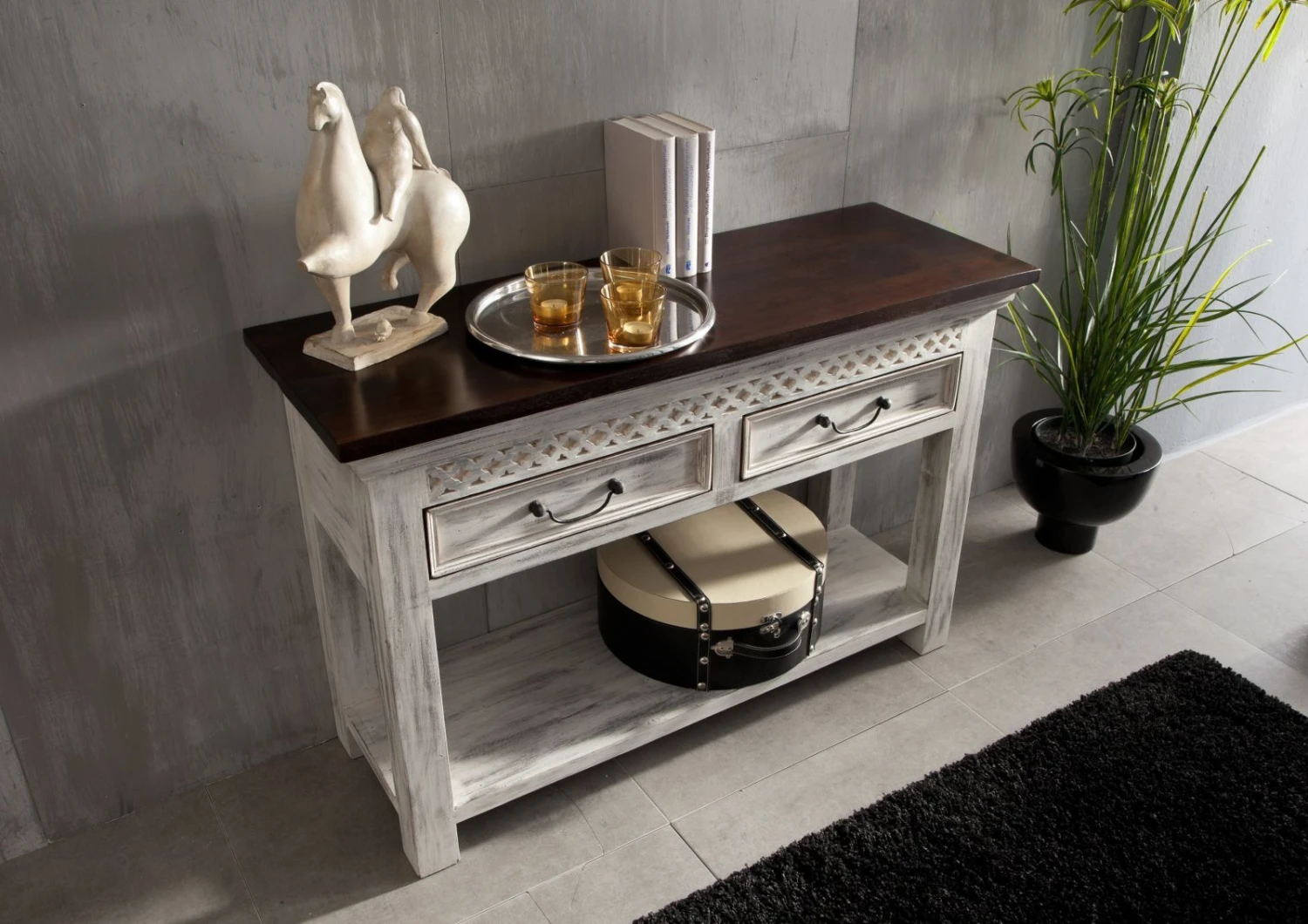 Inspirée du charme dantan et de lélégance des meubles anciens, notre série CASTLE ANTIK saura séduire tous les amateurs de la douceur de vivre à la campagne. Ces pièces uniques contribueront à apporter harmonie et chaleur à une décoration intérieure provinciale- antique. Produits à partir dune association entre bois massif d’acacia laqué et bois massif de manguier ciré, le mobilier de cette collection se distingue par un effet vieilli, idéal pour créer une ambiance rustique-romantique. Vous pourrez trouver parmi notre vaste sélection de meubles, la perle rare qui embellira votre pièce de vie avec la subtilité et la finesse du style campagne-chic. Il y a de grandes chances que vos invités vous envient pour ces objets uniques.