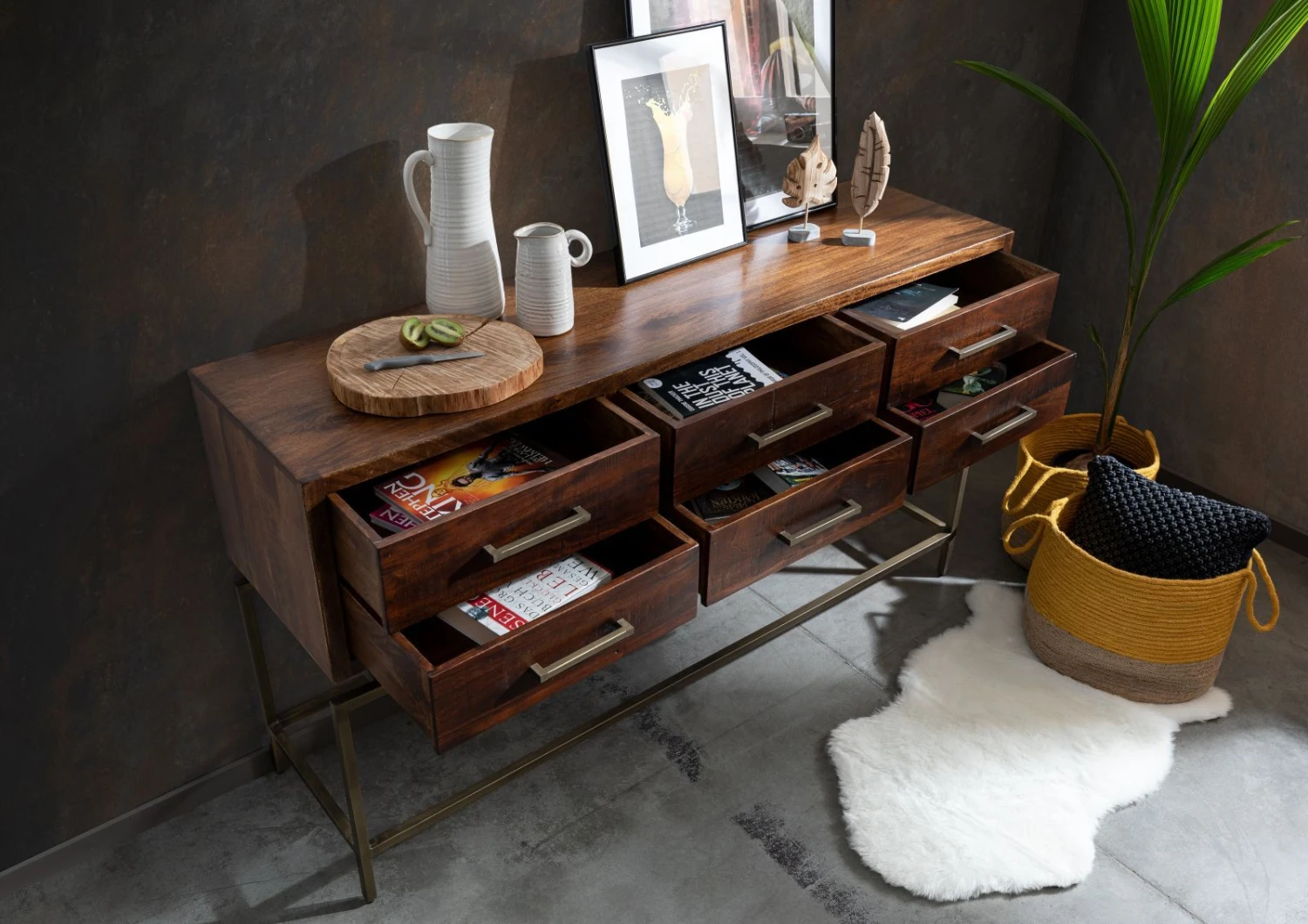 Laissez-vous tenter par la modernité de notre série STILMÖBEL sur un fond art déco. Découvrez l´art et la manière de marier les formes rectilignes et les motifs étonnants – marquetée, gravés ou incrustés- sur du bois exotique afin de créer des meubles uniques. Avec un charme rétro et un aspect ethnique enivrant, cette série propose une large gamme de mobilier, en acacia ou manguier, dont les façades sont sculptées et travaillée artisanalement avec soin. Vous pourrez associer ces meubles à toutes sortes de décorations – quelles soient d’inspiration exotique ou contemporaine. Ces pièces uniques apporteront une ambiance envoûtante et originale à votre intérieur.