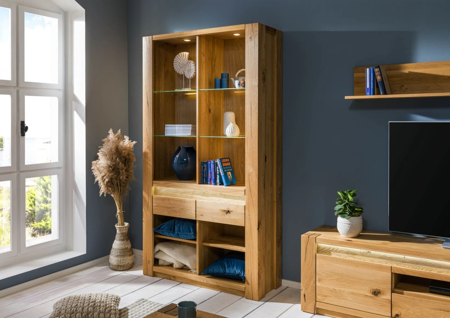 Voilà la combinaison réussie d´une vitrine et d´une bibliothèque : les étagères en verres, en partie haute de l´étagère sont éclairées par un système LED intégré : vos objets décoratifs et vos pièces de collections seront mis en valeur.