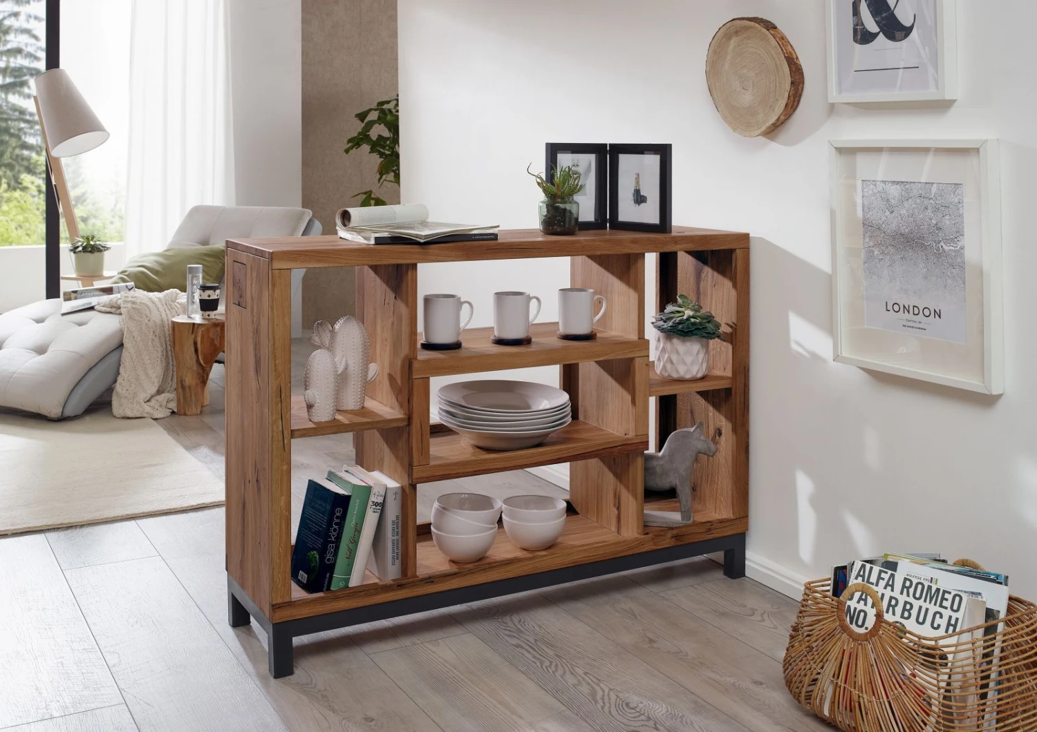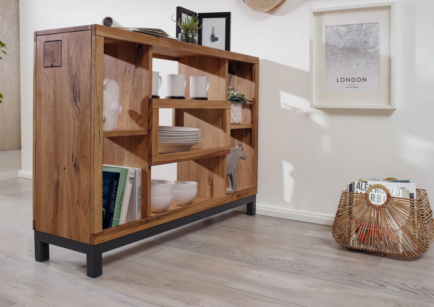 La collection VILLANDERS combine le bois de chêne sauvage, et ses fissures naturelles, avec des éléments métalliques noirs. Cette série de meubles modernes de haute qualité est disponibles en trois teintes élégantes. Qu’il s’agisse de la couleur tabacco brown, bianco ou bois naturel, les trois variations de cette série VILLANDERS apporteront charme individuel à votre intérieur. Le chêne sauvage se distingue non seulement par sa grande stabilité et sa qualité exceptionnelle, mais aussi par son aspect brut et son allure sauvage. En effet, son grain impressionnant, ses nombreux nuds et ses fissures naturelles, caractérisent la surface de chaque meuble rendant exclusif le mobilier de cette série très particulière. Pour un plus grand confort, tous les tiroirs et portes de ces meubles sont équipés de charnières et de glissières à fermeture en douceur.