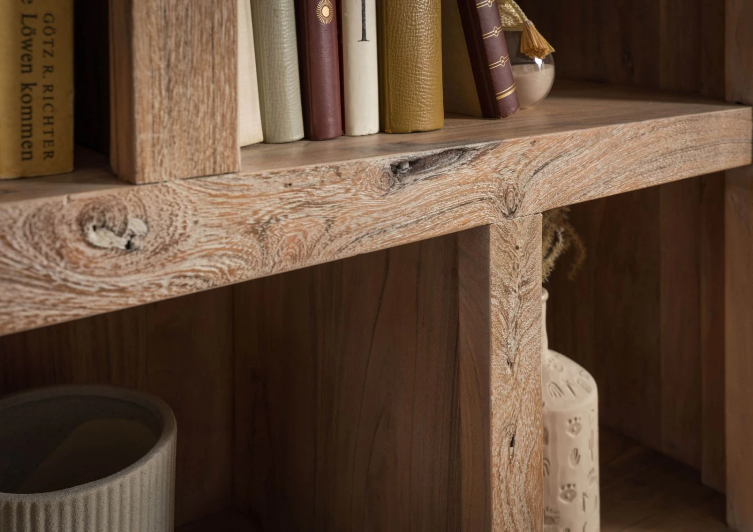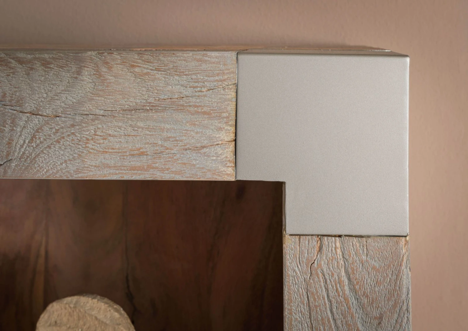 - le bois dur d’acacia rencontre des éléments en bois de récupération à la texture captivante