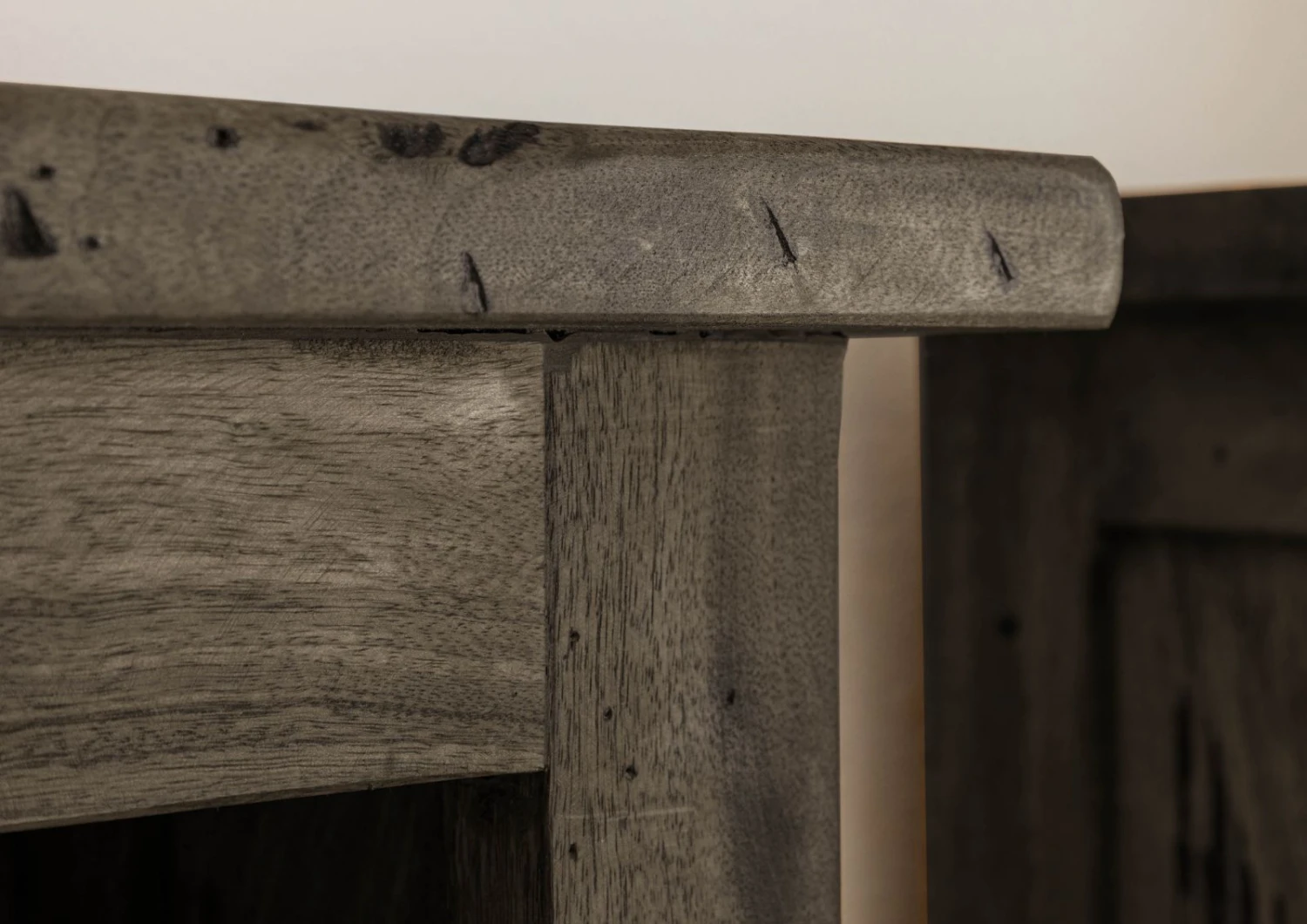 - bois massif et robuste, à l’aspect vieilli, avec marques visibles de rabotage