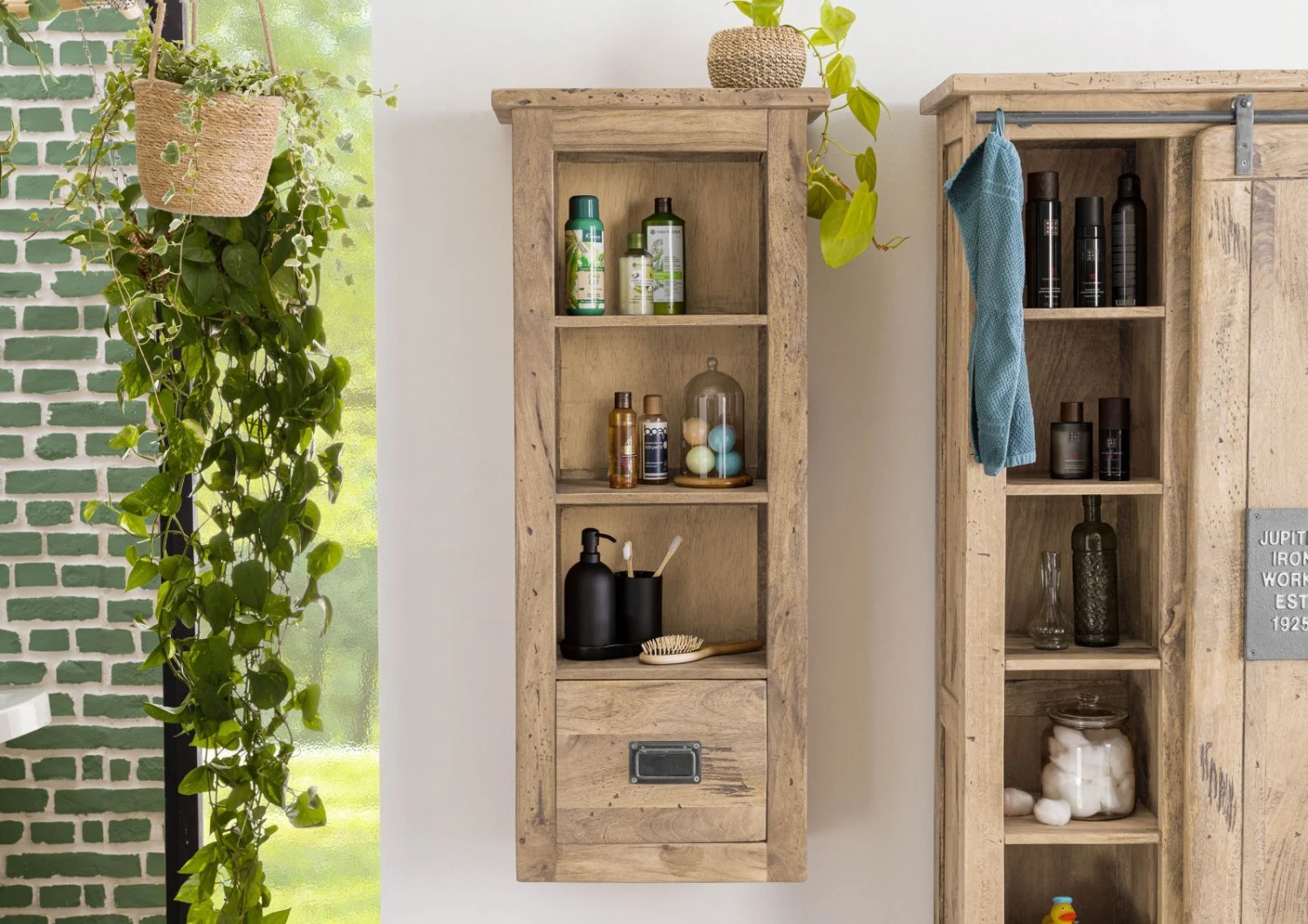 Mais ce n’est pas tout : la poignée en métal du tiroir apporte également une touche rustique à ce meuble, et lui permet de s’intégrer parfaitement dans le style industrielactuellement très tendance. Ensemble, les différents éléments de design se complètent pour créer un meuble absolument unique. Que ce soit dans la salle de bains, la cuisine, la chambre des enfants ou le salon, cette étroite étagère murale constitue un véritable accroche-regards et s’accorde parfaitement avec les autres meubles de la gamme RAILWAY.