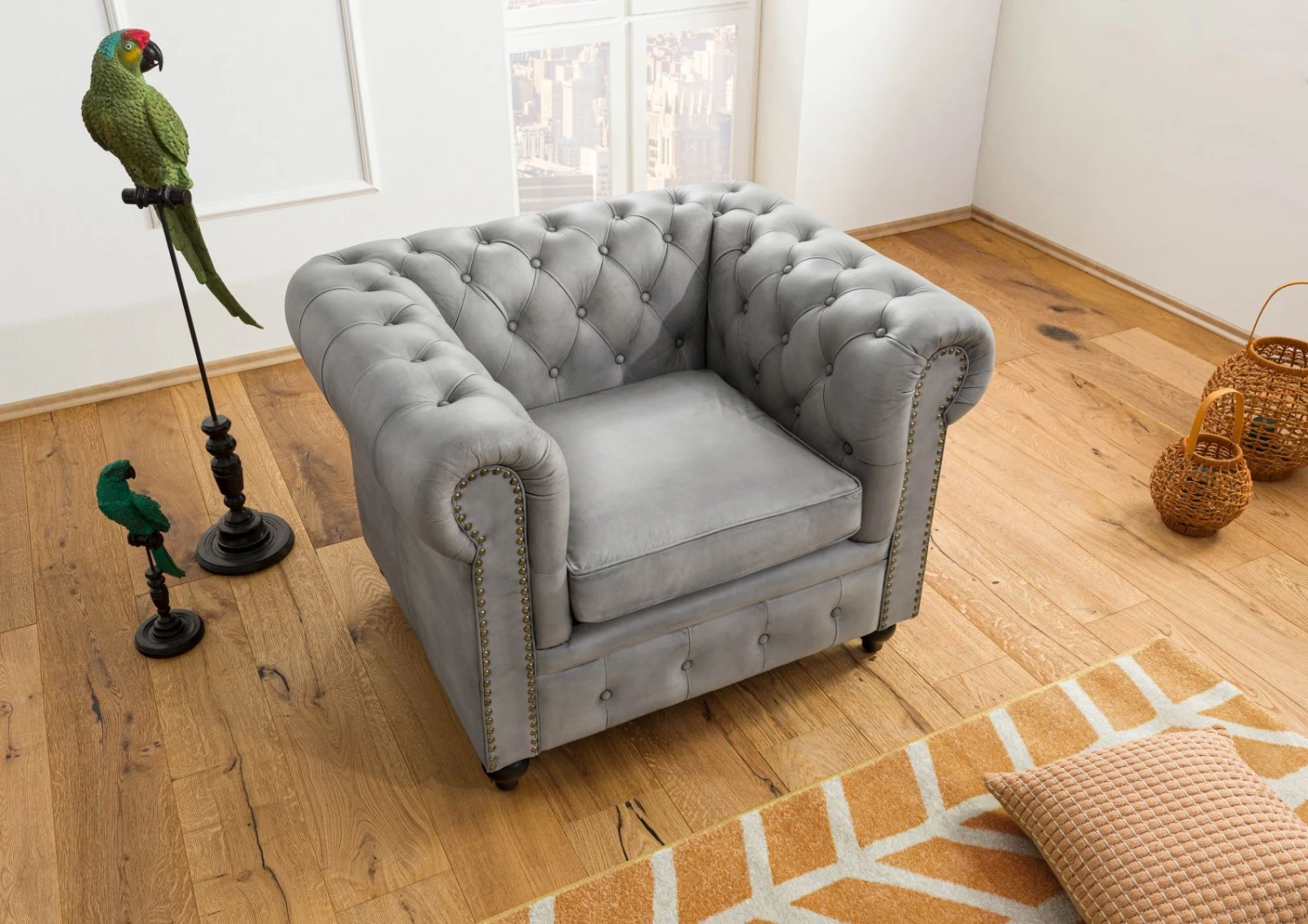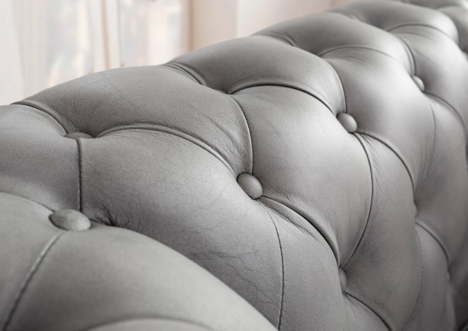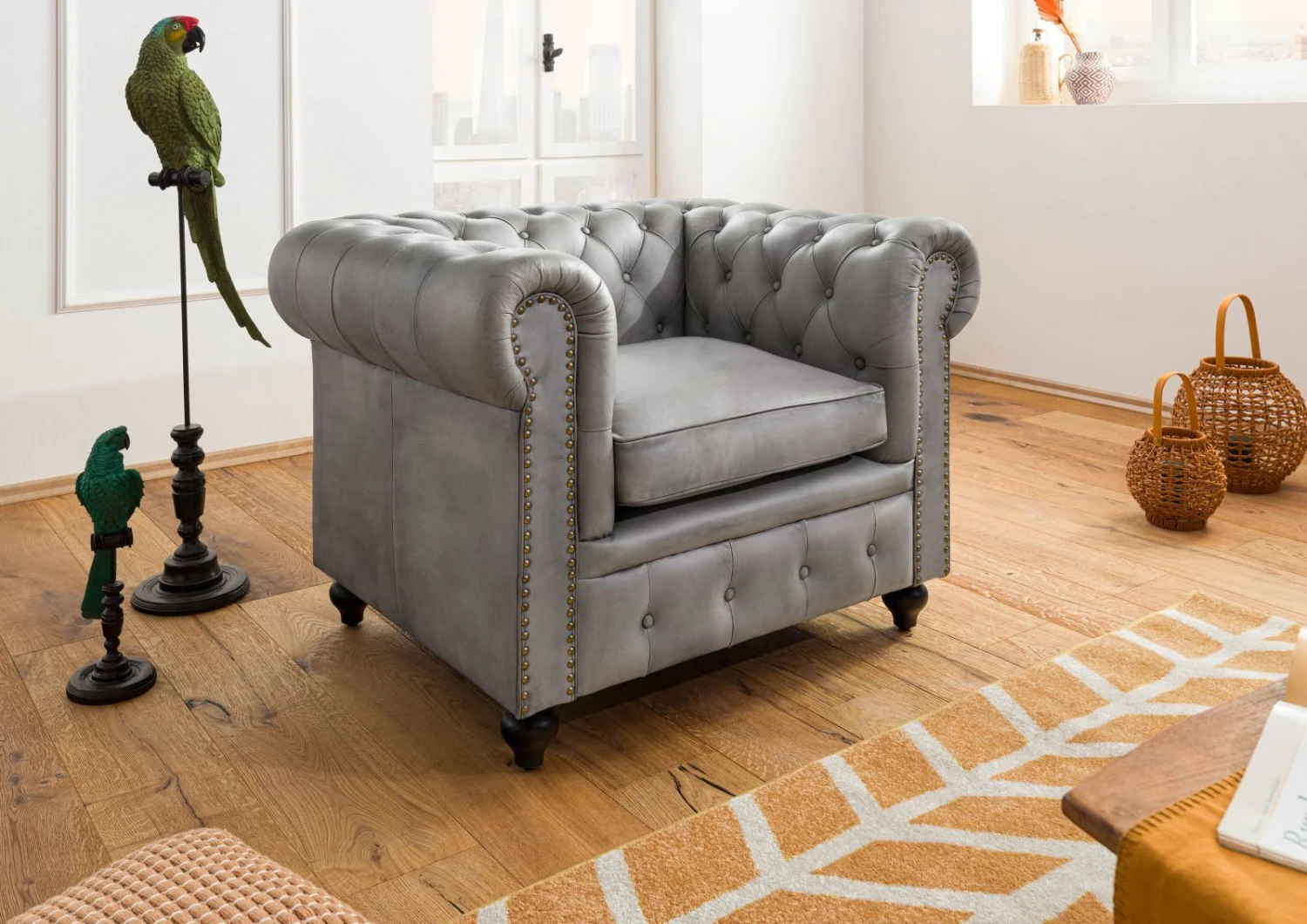 - fauteuil Chesterfield en cuir gris, au design luxueux