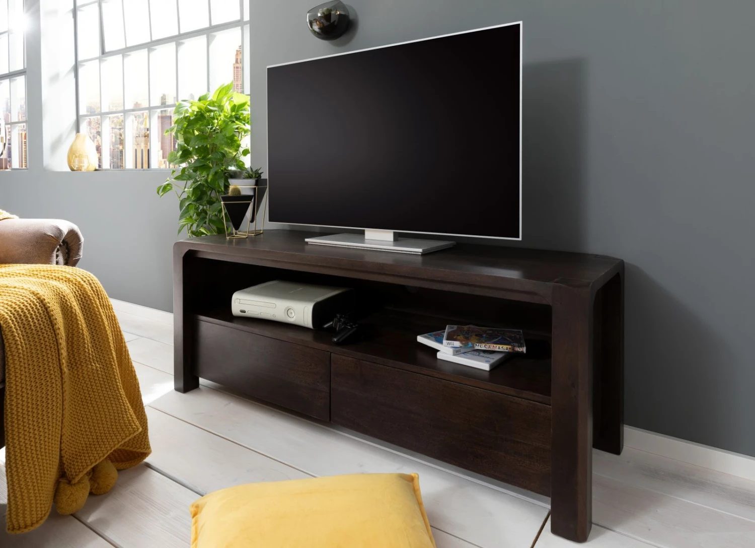 Description du produit Meuble TV 125×45 Acacia laqué Tabac BUENO #4002
