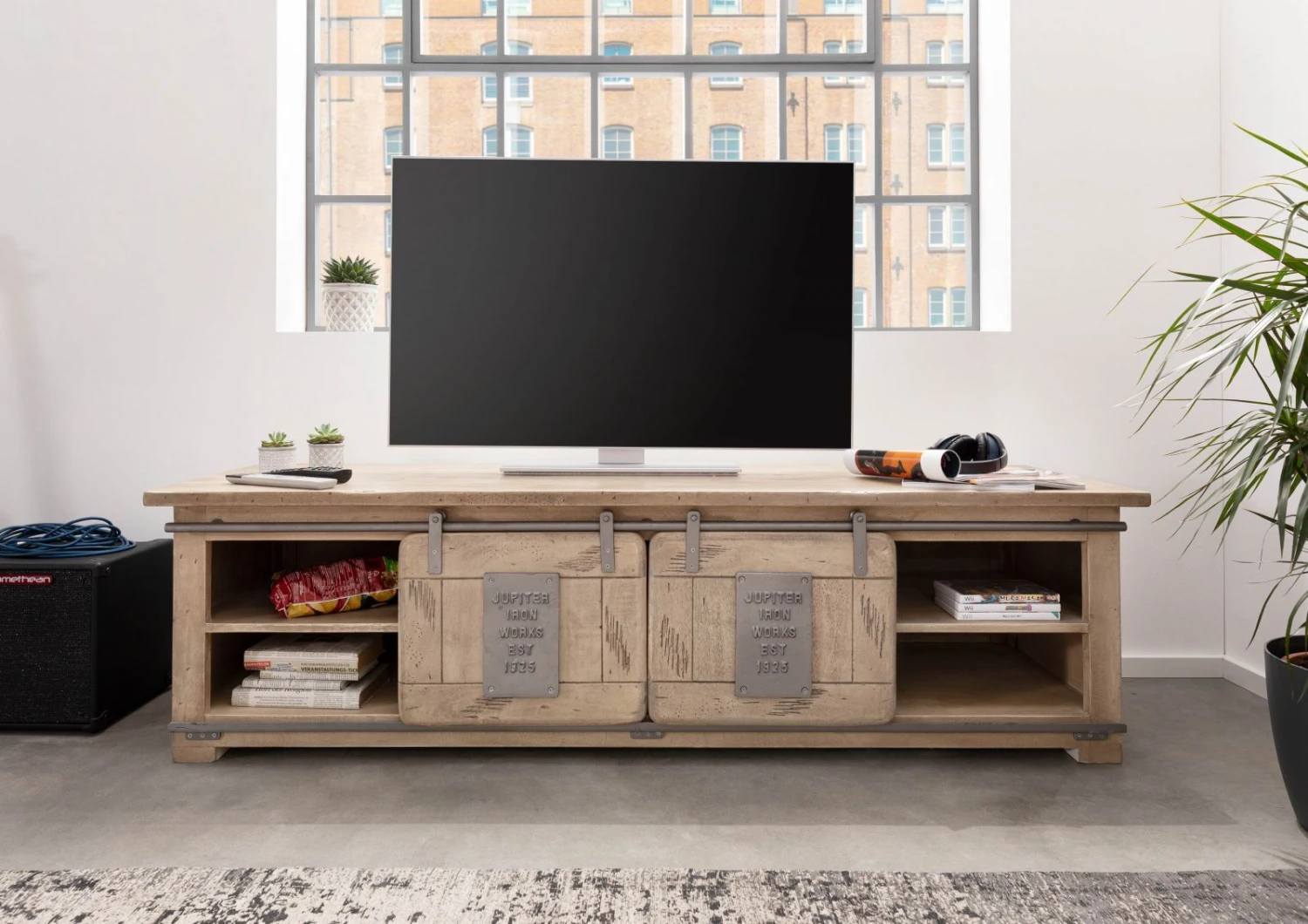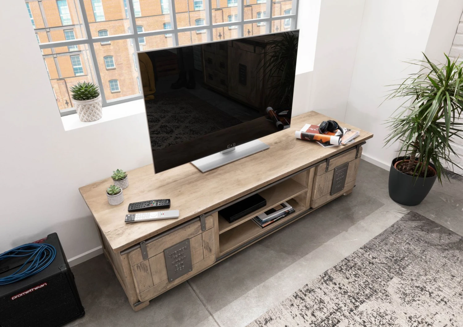 Description du produit Meuble TV 180×55 Manguier laqué blanchi RAILWAY #335
