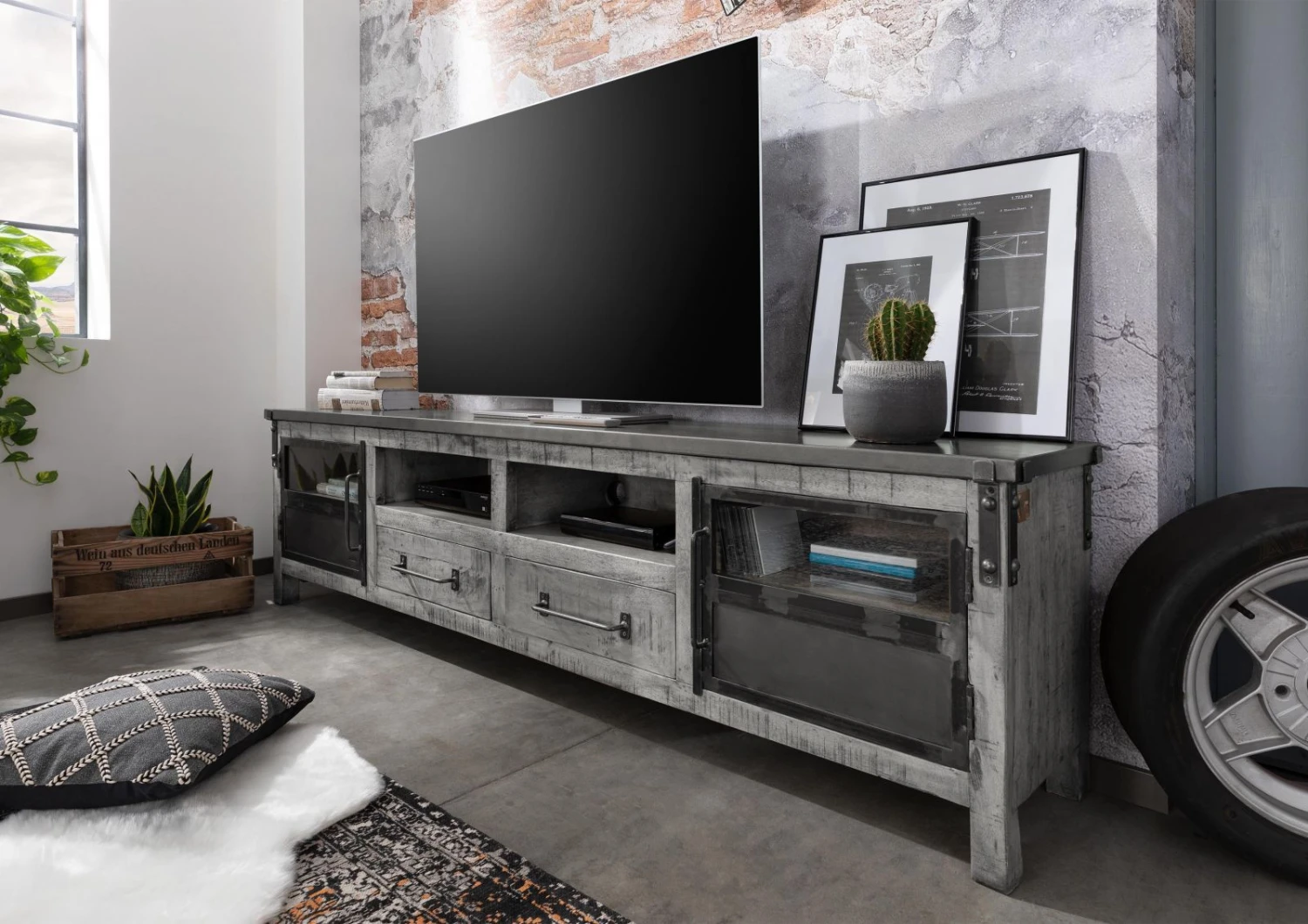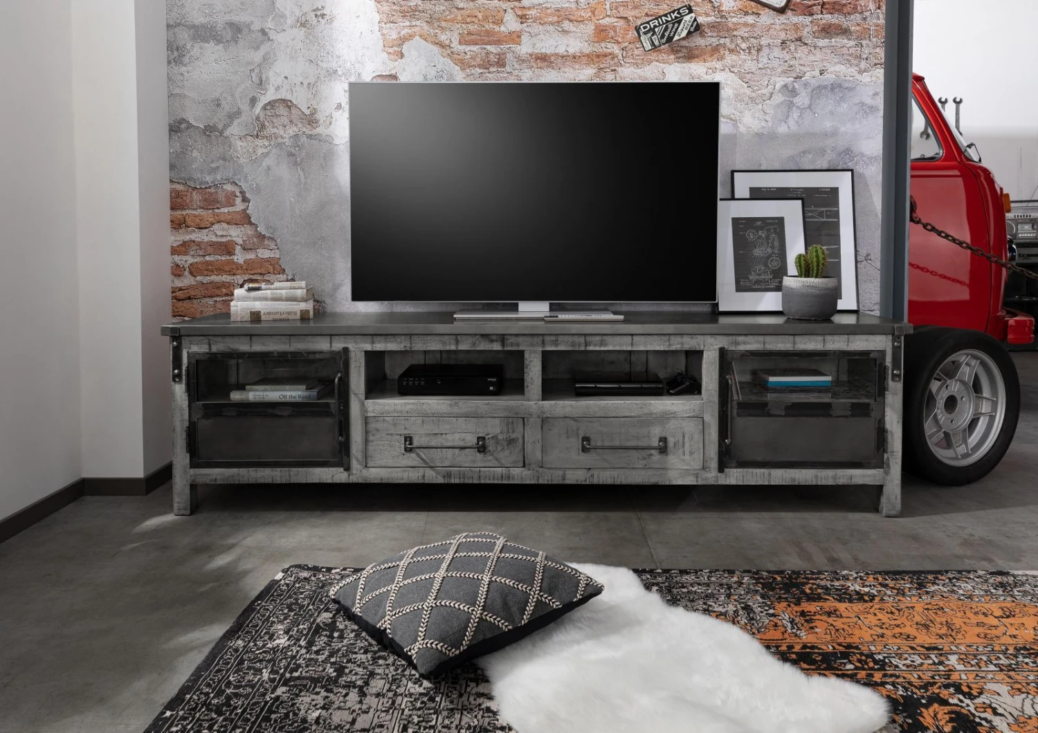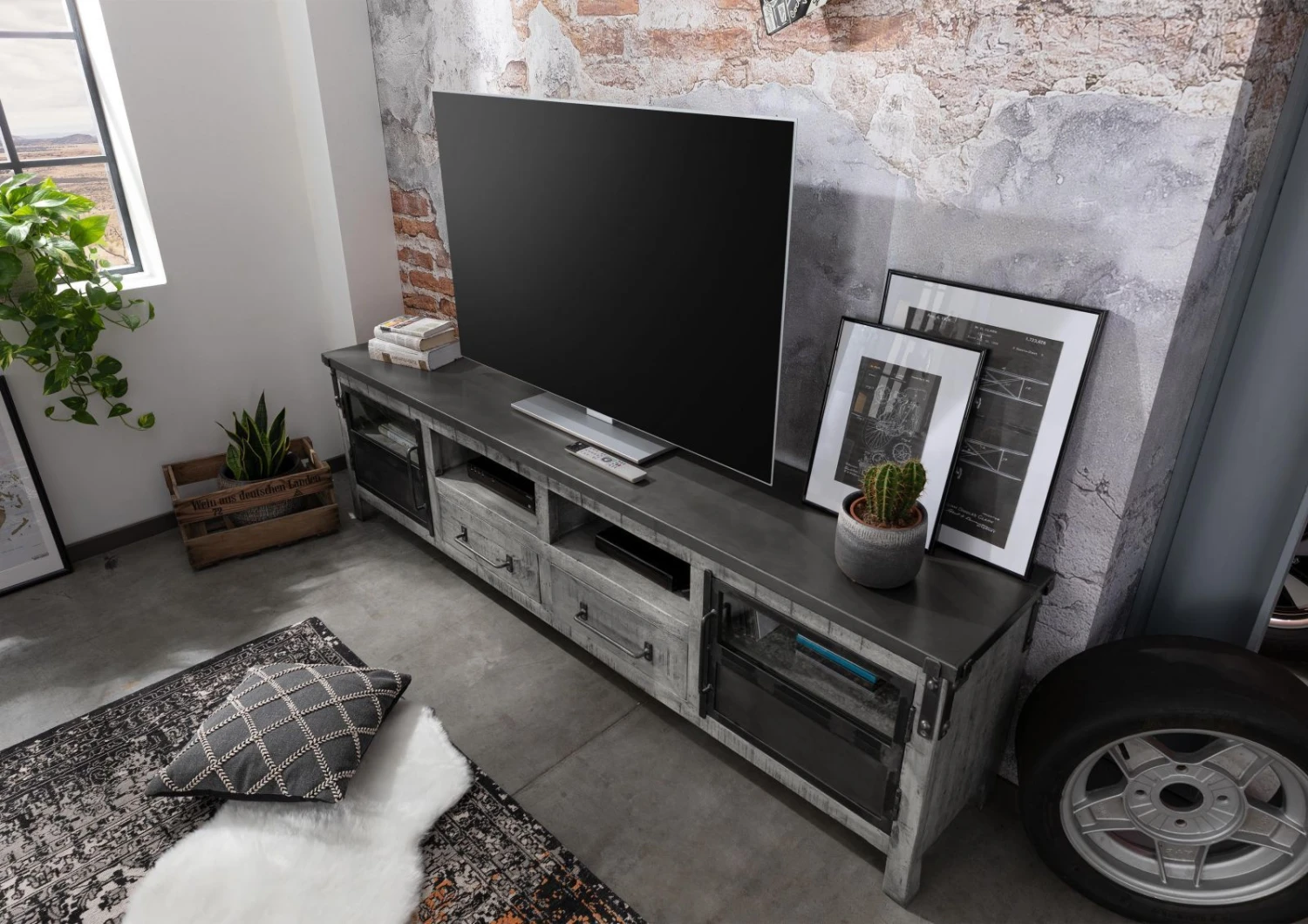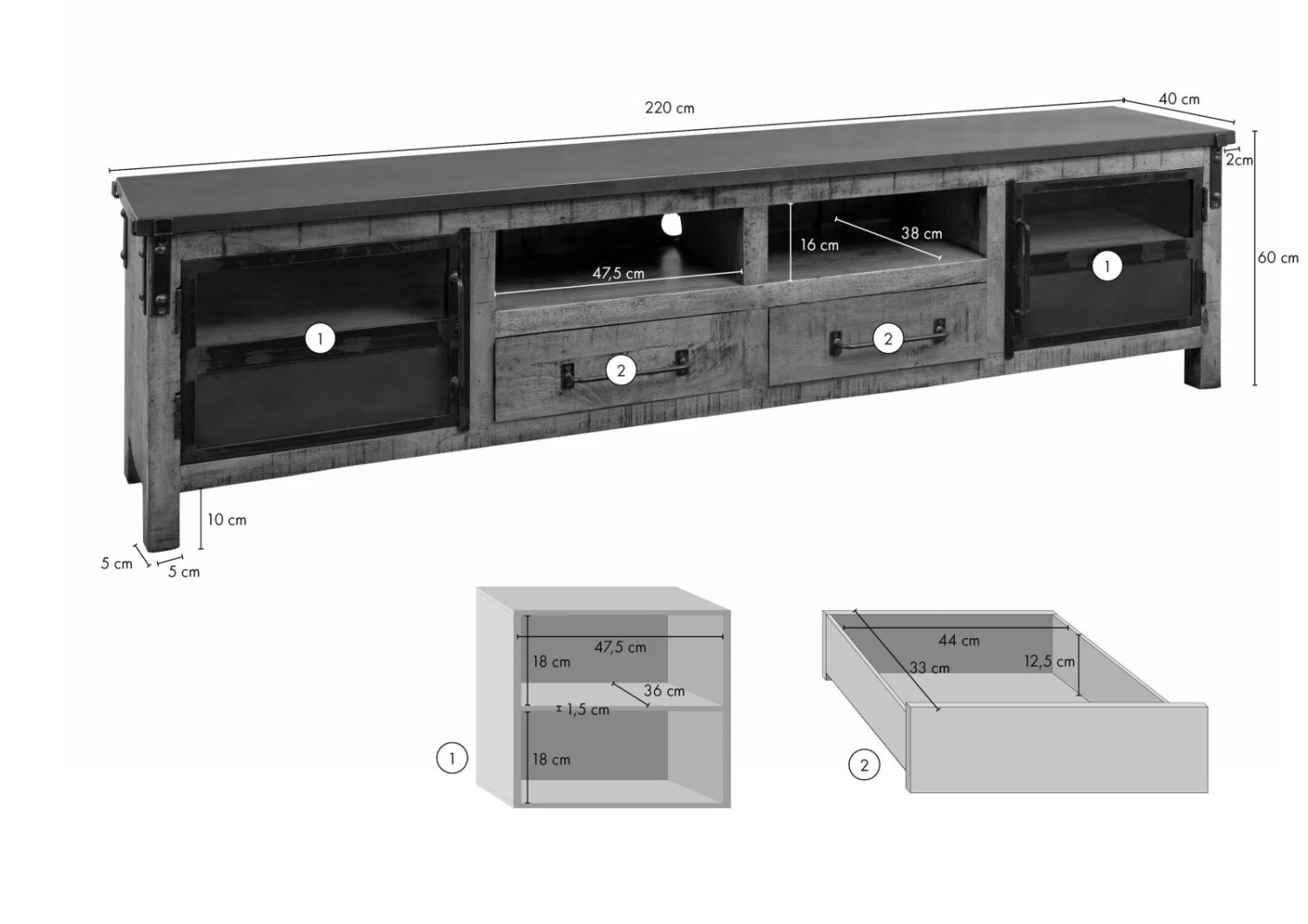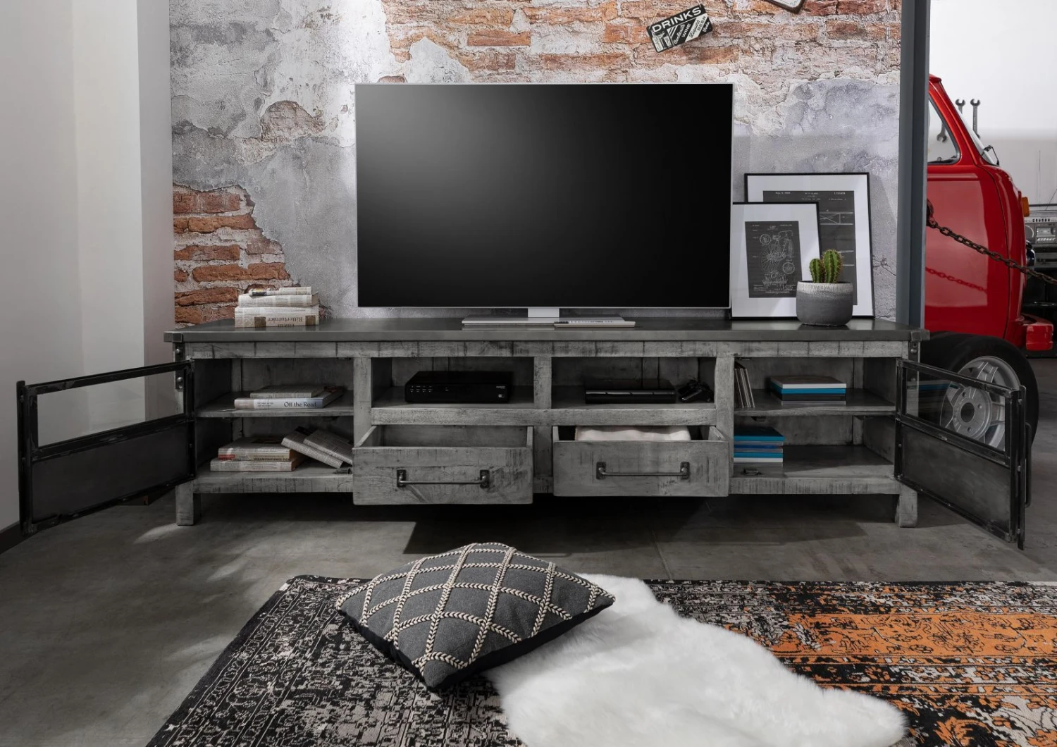Description du produit Meuble TV 220×40 Manguier laqué Gris HEAVY INDUSTRY #135