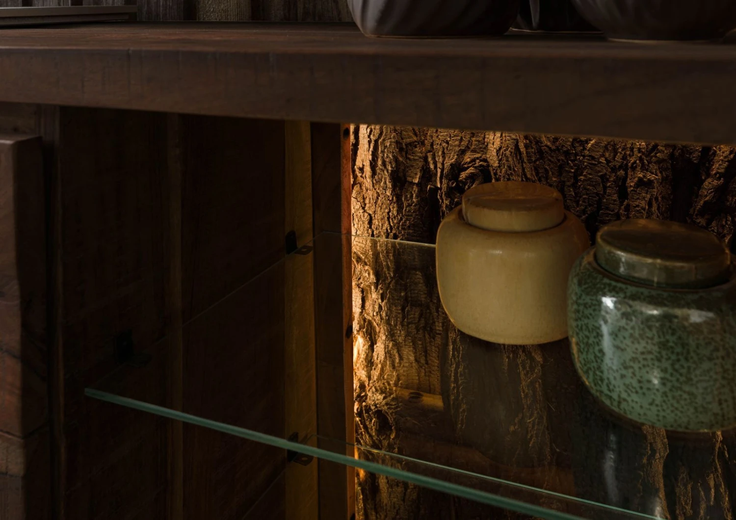 Un rangement avec une double porte et une étagère en bois dacacia massif