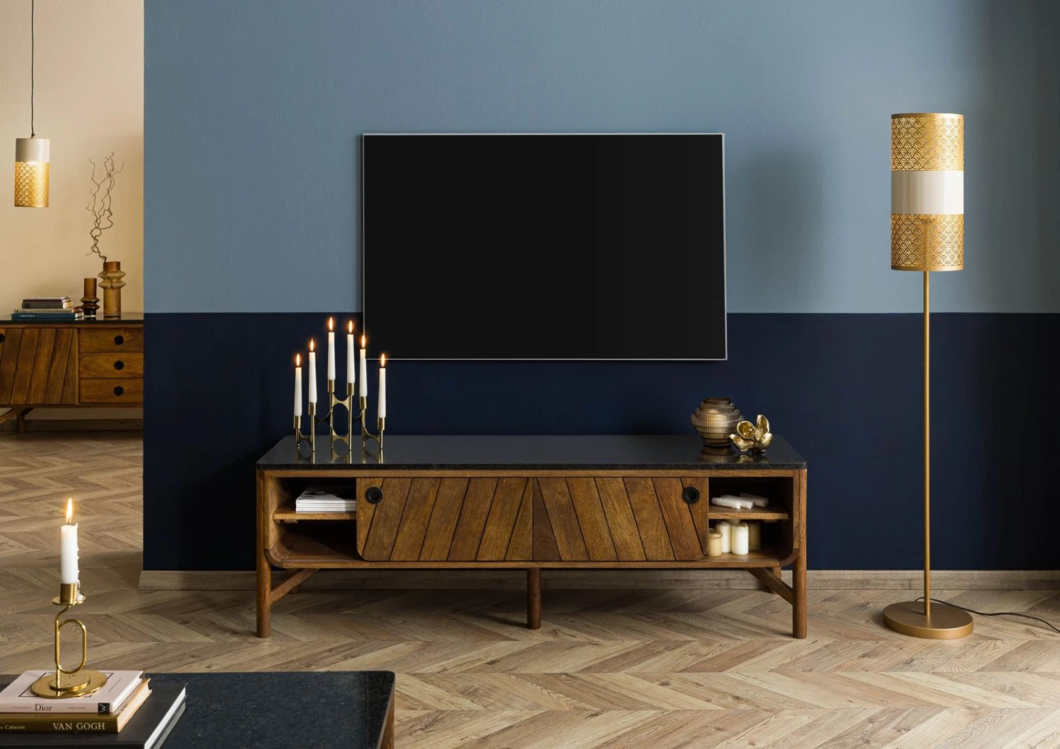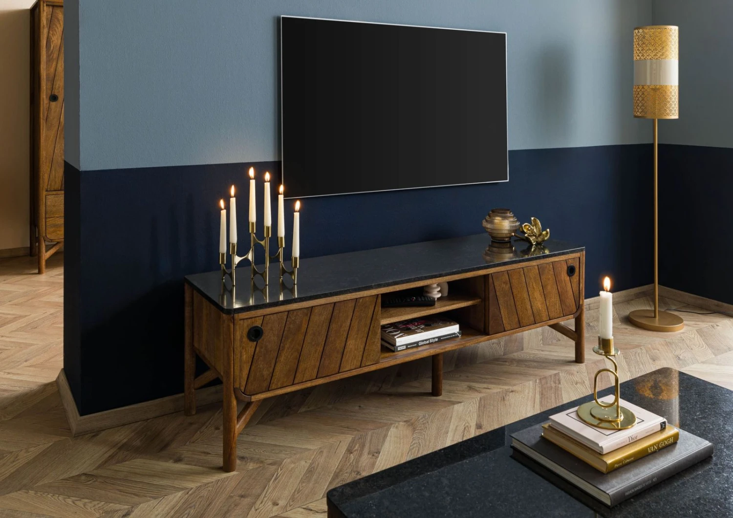 Description du produit Meuble TV Manguier 160x45x50 marron huilé / granit foncé LOS ANGELES #101