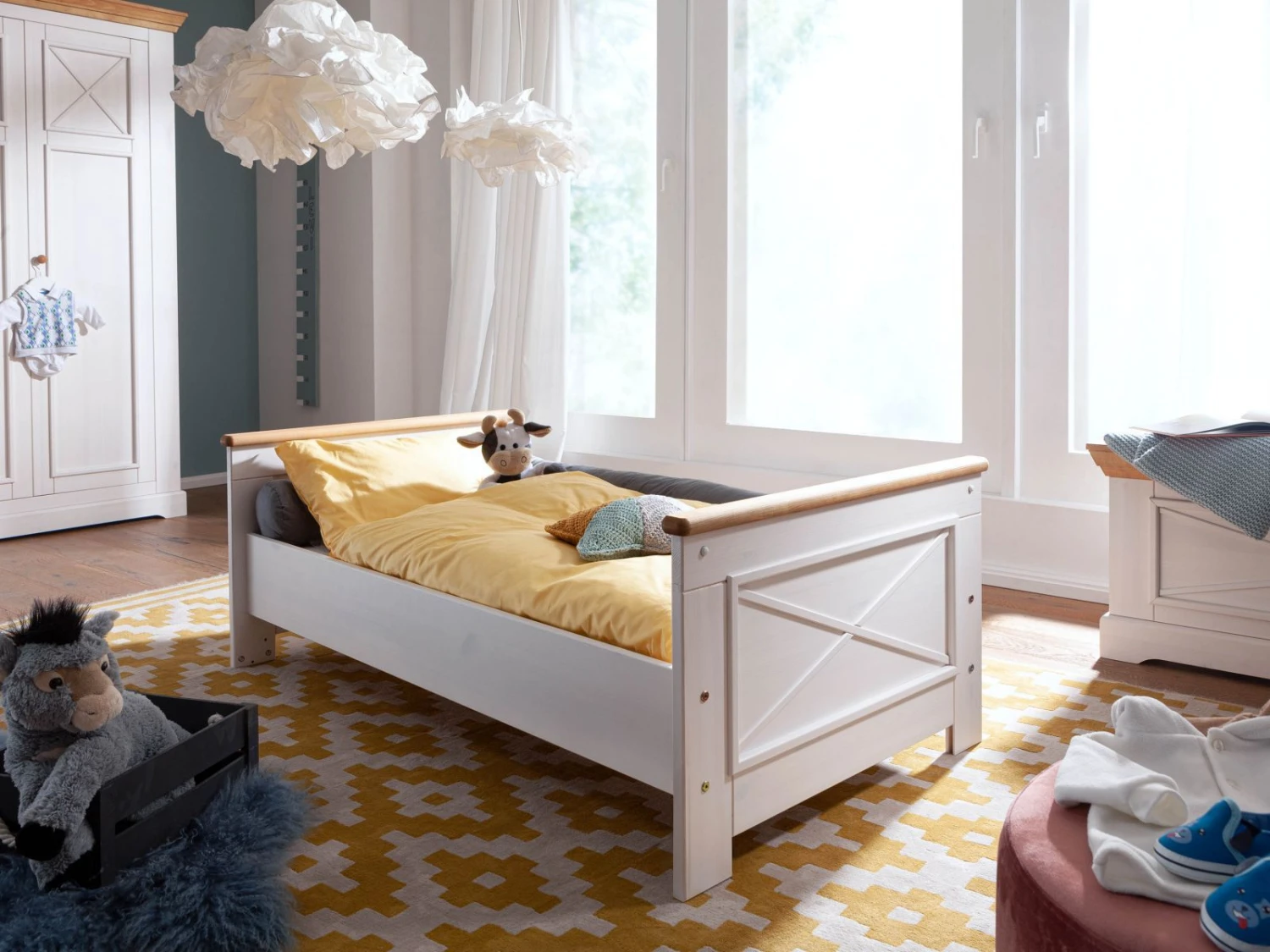 Grace au kit de deux cotés de lit, le lit de bébé HANNA est très pratique :il suit la croissance de votre enfant avec élégance et style : les cotés de lit enfants s´adaptent parfaitement : ils sont en pin ciré blanc comme le lit lui-même.