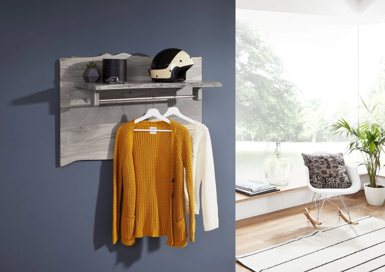 La barre de penderie bien large est fixée à une planche transversale, qui peut également servir d’espace de rangement pour vos clés, portefeuille et autres. Là encore, cette planche n’a pas été découpée de manière rectiligne : toutes les sinuosités liées à la croissance de l’arbre et les irrégularités naturelles du bois ont été conservées. Le bois d’acacia marque également des points en matière de durabilité : grâce à la dureté et à la résistance exceptionnelles de ce matériau, cet élément mural esthétique conservera longtemps toute sa beauté.