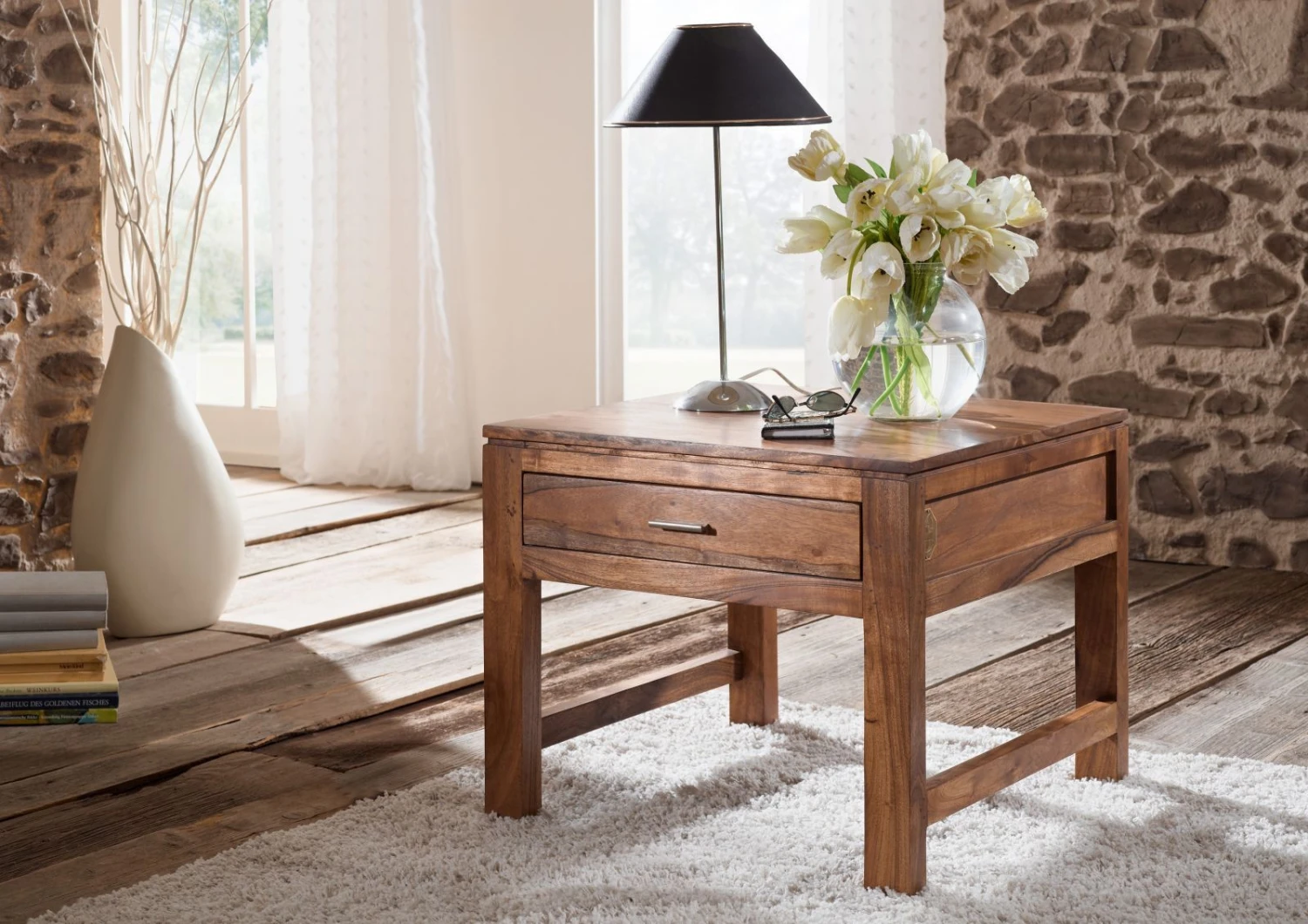Description du produit Table d’appoint 60×60 Acacia laqué Golden honey SHAMAN #71