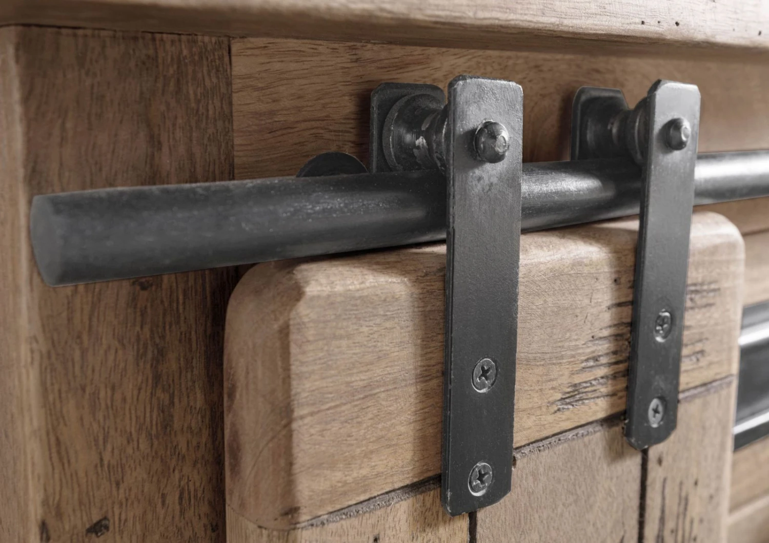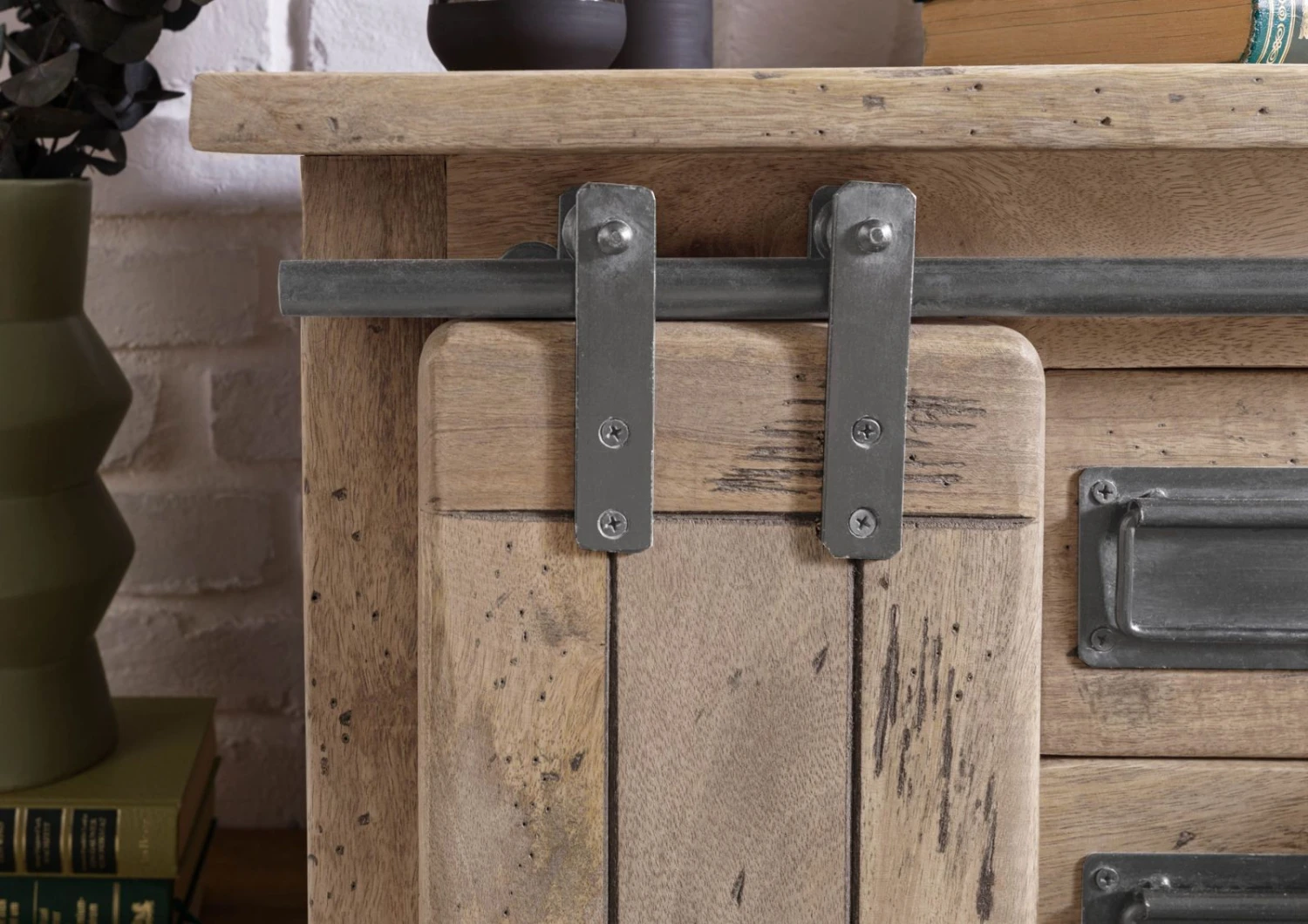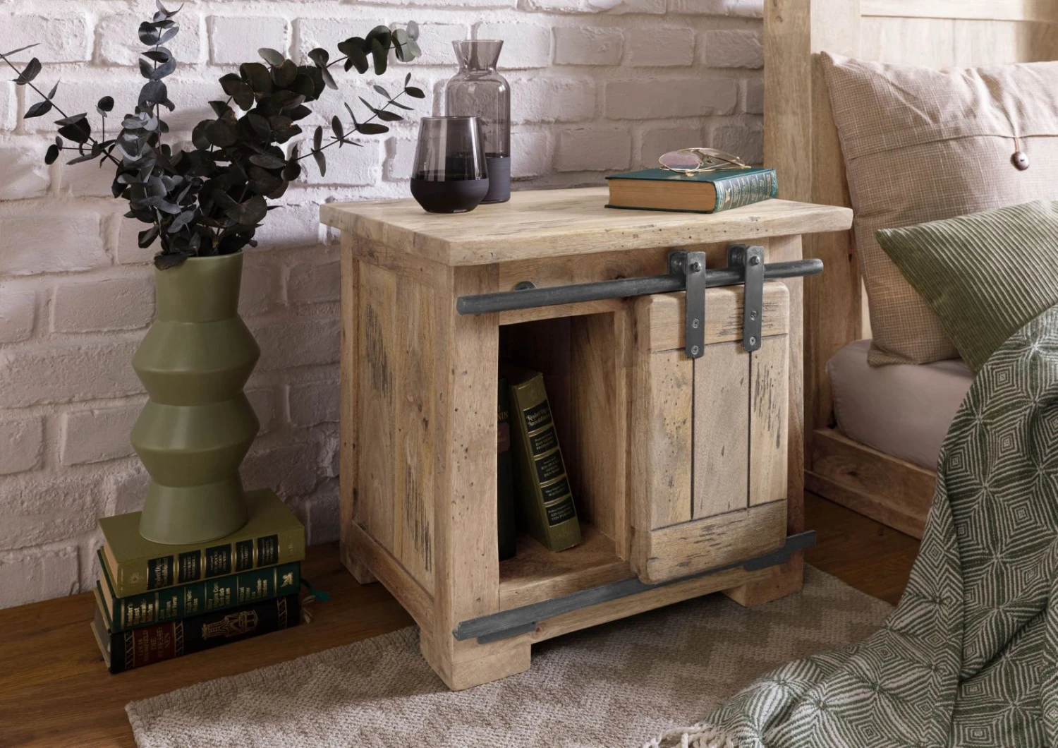 Les poignées métalliques noires des tiroirs soulignent également le charme industriel de cette pièce de mobilier en bois massif. Sans oublier un certain je-ne-sais-quoi que lui confère son design original avec porte coulissante : une porte fixée sur deux rails métalliques, pouvant ainsi être déplacée de gauche à droite. Cette table de chevet n’est donc pas un simple espace de rangement supplémentaire à côté du lit : elle est également un véritable manifeste sur le plan esthétique.