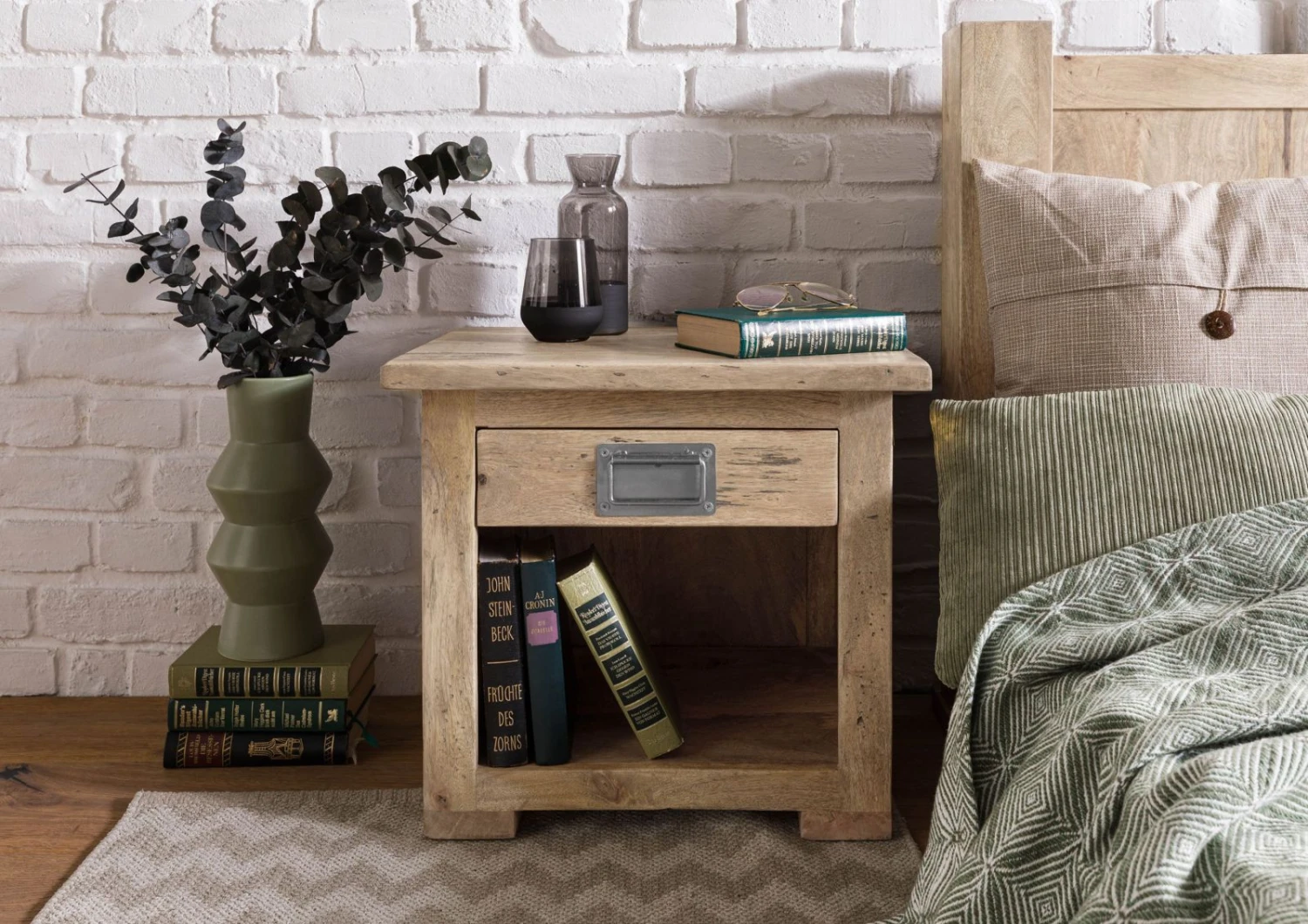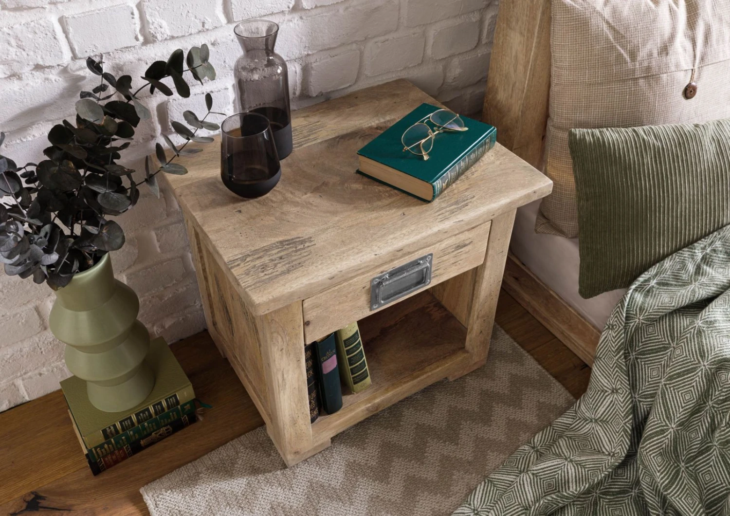 Une ambiance rustique dans la chambre Ă coucher : table de chevet de style industriel, en bois de manguier
