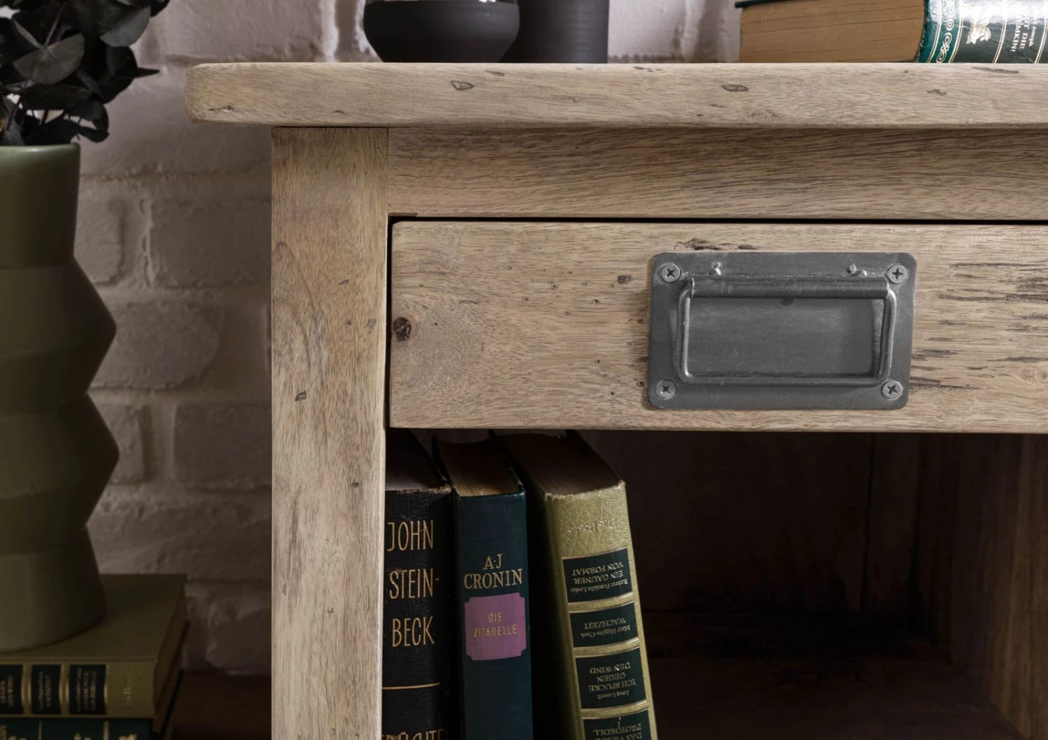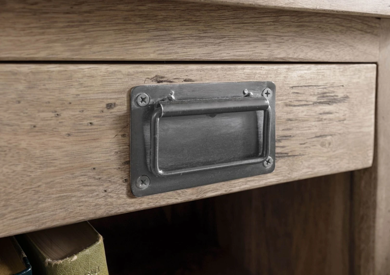 - la robuste poignĂ©e en mĂ©tal noir du tiroir s’harmonise avec le veinage marquĂ© du bois