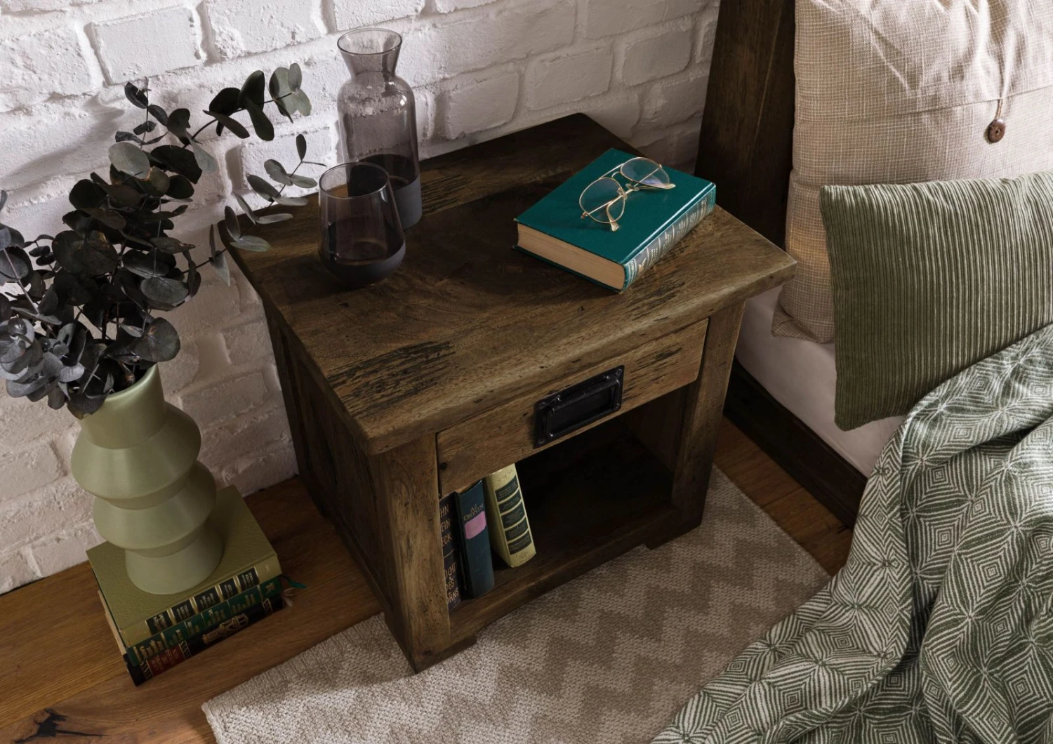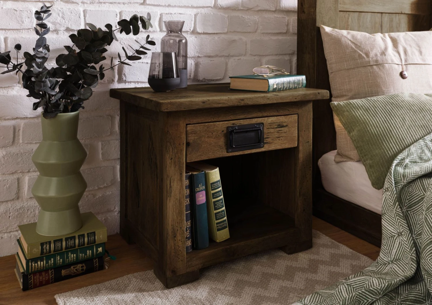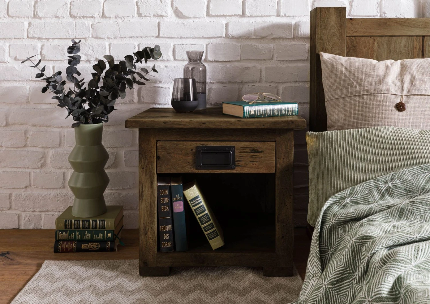 - Bois de manguier dans un style industriel : grâce à son design exceptionnel, cette table de chevet se distingue des autres meubles de chambre à coucher