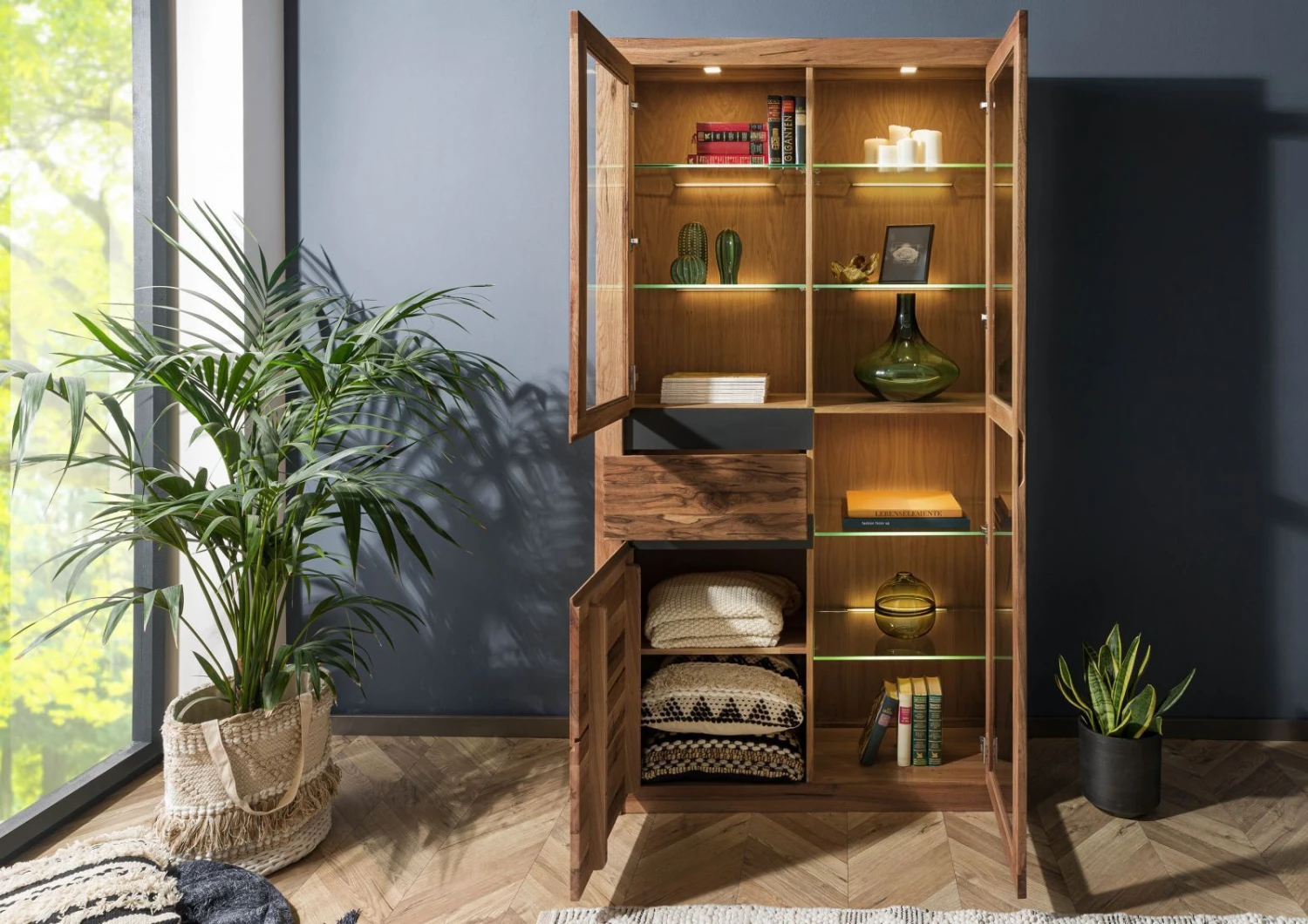 Présence et élégance, cette vitrine embellira de par son aspect sobre et chaleureux tout aussi bien vos pièces à vivre que votre bureau ou votre salle à manger.