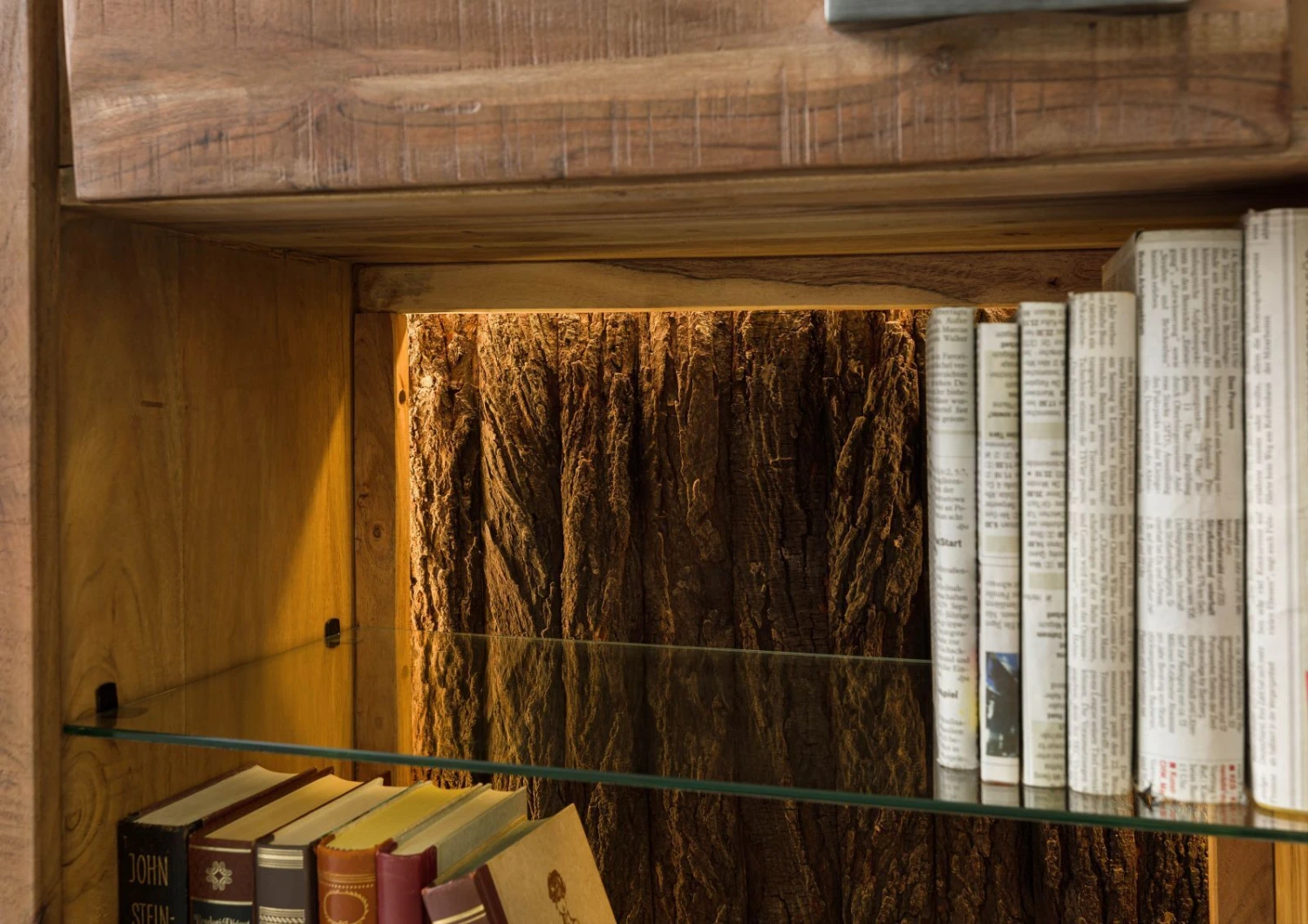 Cette armoire faisant aussi office de bibliothèque sera le complément parfait pour un agencement chaleureux dans son décor naturel. Son rangement pourra accueillir non seulement vos livres mais tout autres bibelots ou votre minibar. Doté d´un éclairage LED tamisé, le décor décorce de bois dacacia assurera un effet d´originalité sans pareil.