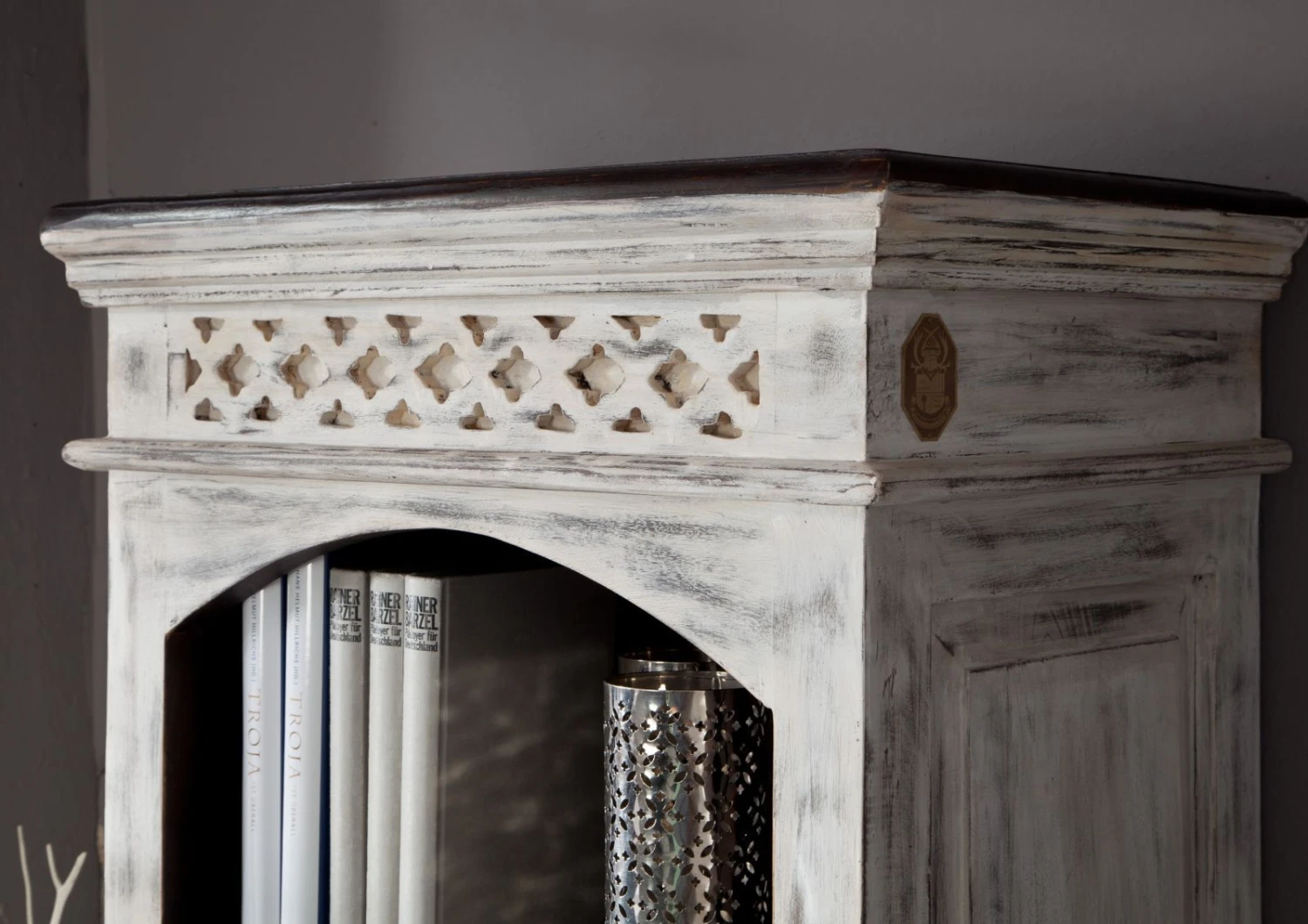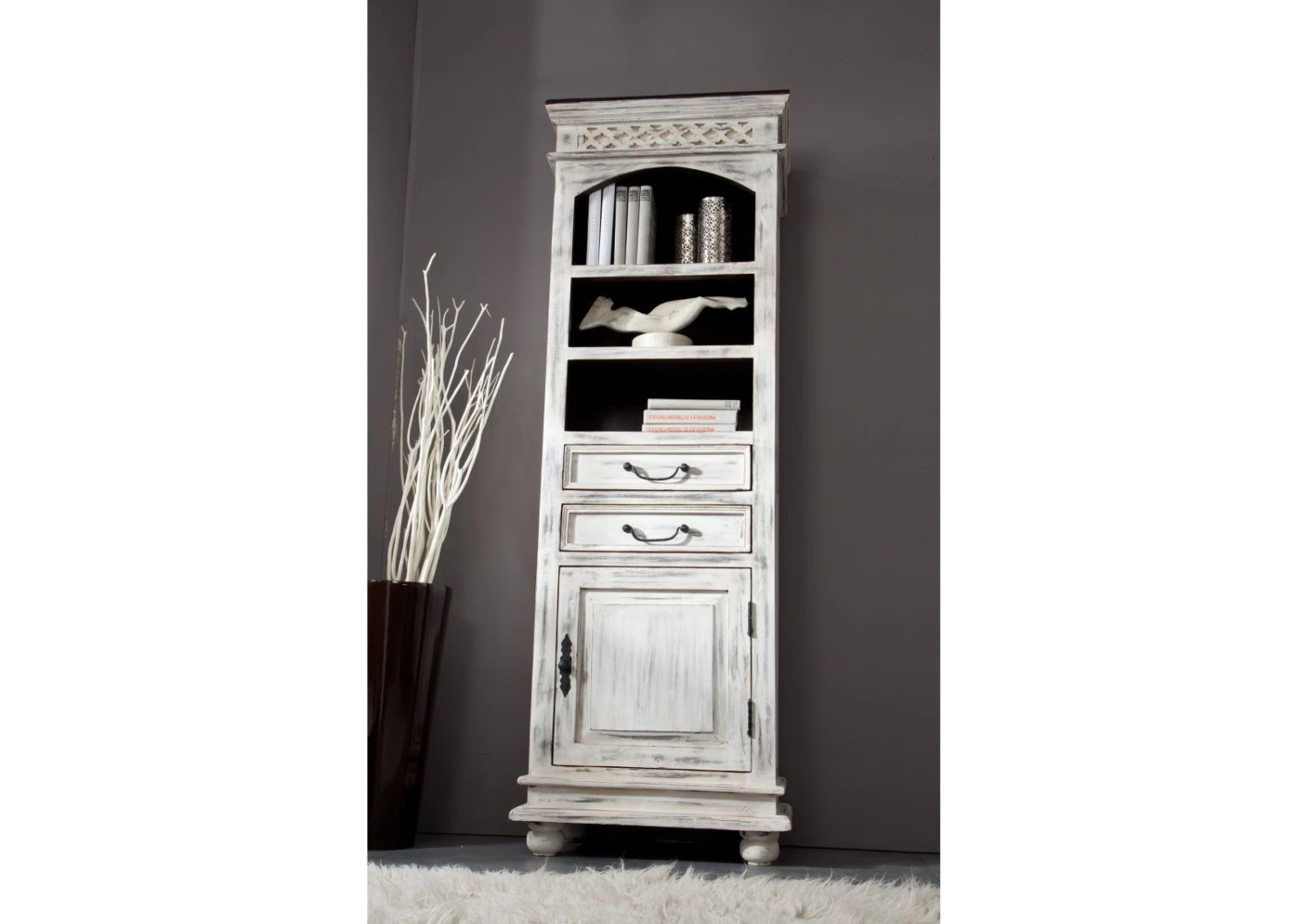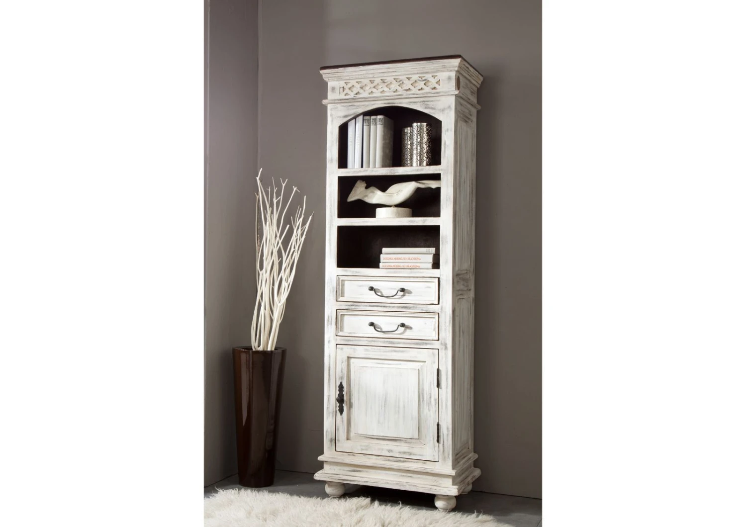 Description du produit Vitrine 60×40 Manguier ciré Blanc antique CASTLE-ANTIK #213