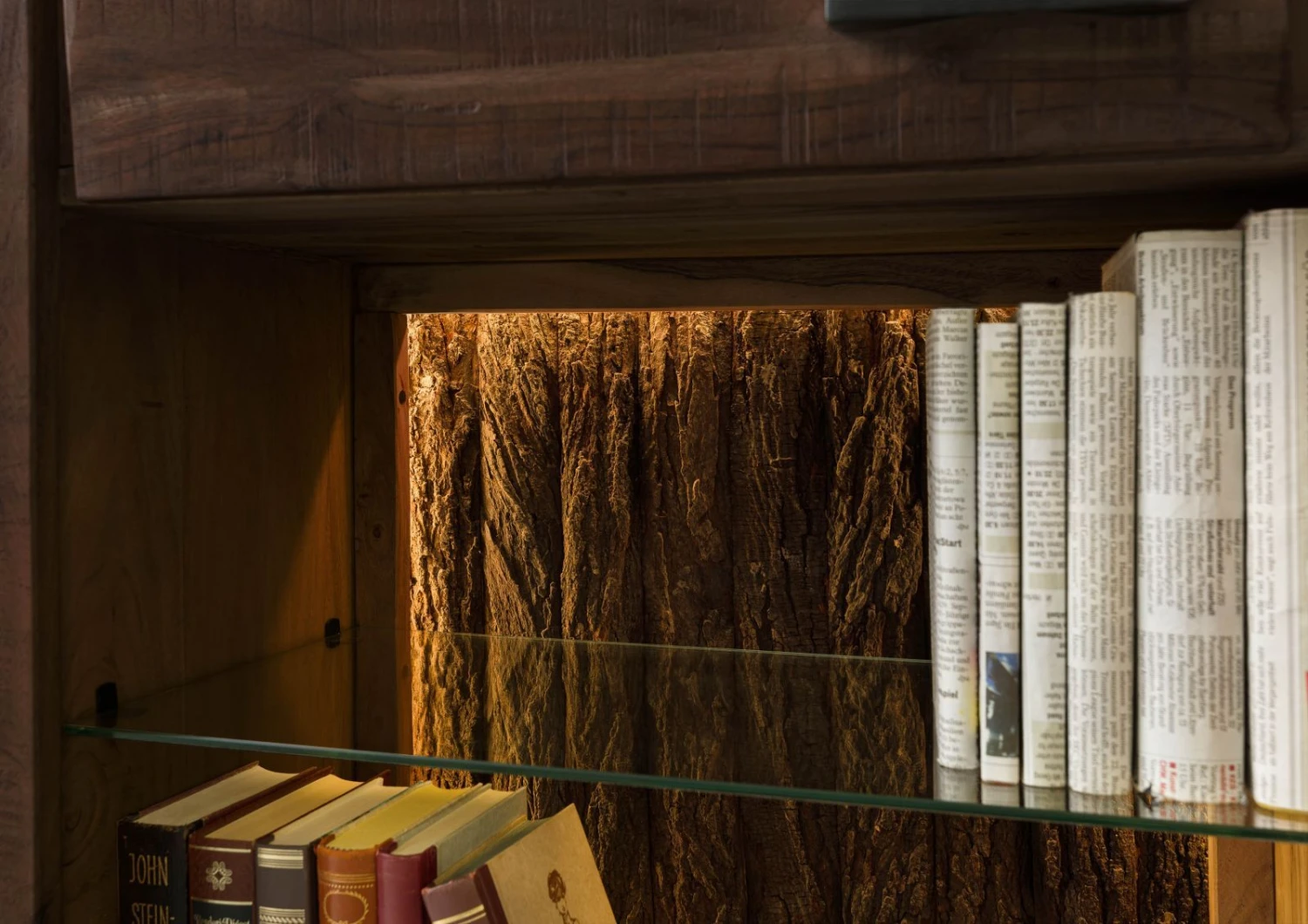 Ce meuble haut faisant aussi office de bibliothèque sera le complément parfait pour un agencement chaleureux dans son décor naturel. Son rangement pourra accueillir non seulement vos livres mais tout autres bibelots ou votre minibar. Doté d´un éclairage LED tamisé, le décor décorce de bois dacacia assurera un effet d´originalité sans pareil.